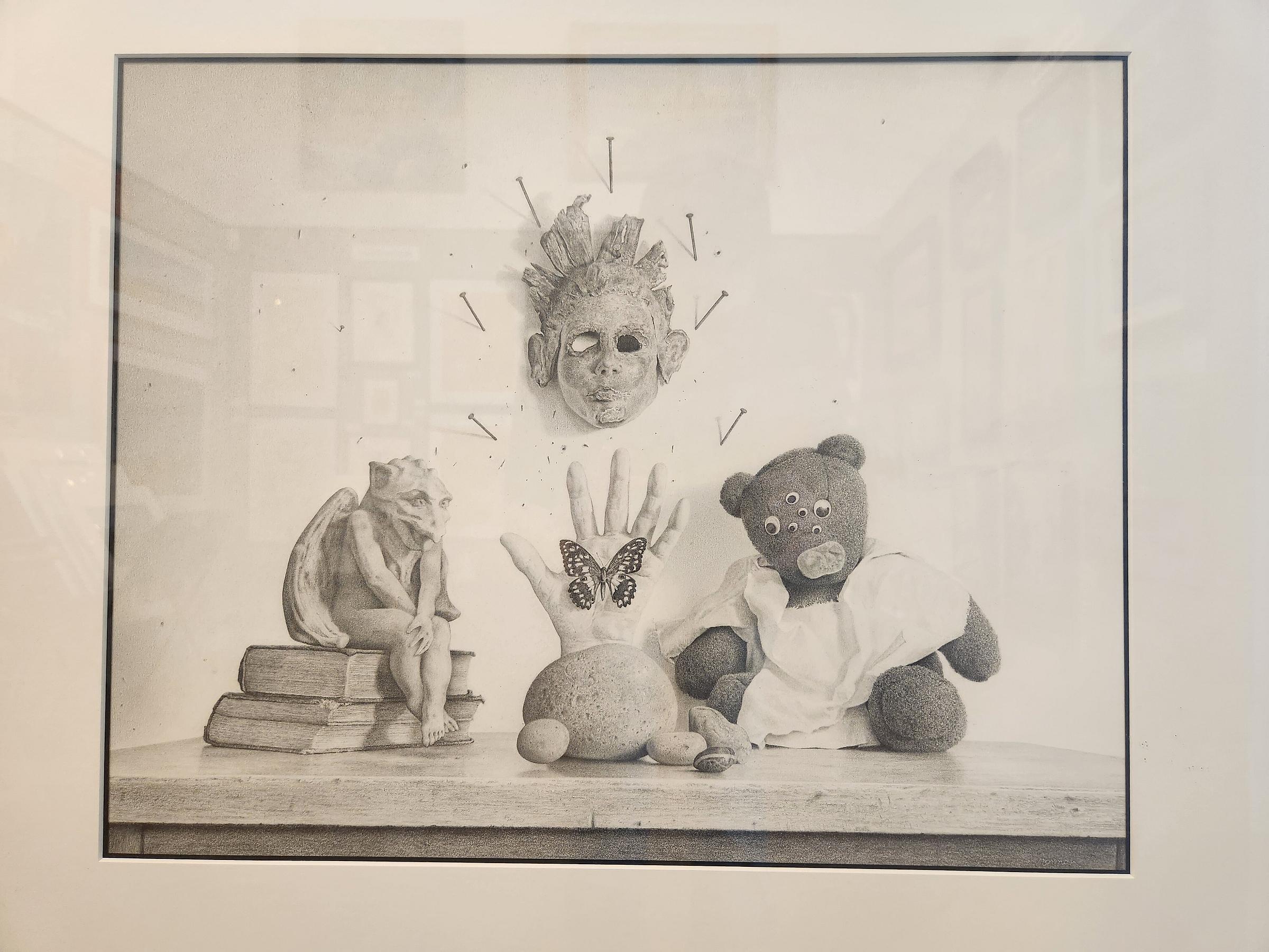 Norman’s “Teddy & Kax at the Shrine of St. Jason The Dubious” does not. On a desk, a still life: a disembodied hand with a butterfly in its palm, wrist obscured by rounded stones, reaches out and up toward the spiky haired, one-black-eyed Michael Myers-style Halloween mask nailed to the wall, surrounded by a halo of nails. In greyscale, familiar and yes, familial too, it is haunting and wrong, but only just so. On the viewer’s right sits Teddy, his six googly eyes making up for the mask’s missing one(s), his mouth a bandaid, garment a rumpled cloth, and slouch resigned. Still fuzzy and comforting, if also projecting an aura of sadness. To the left, Lord Kax, a gargoyle-coded creature with tucked winged, beaked and gnarled face, sloped toes, and a two-book perch. He appears to pant in excitement, for what we do not know.