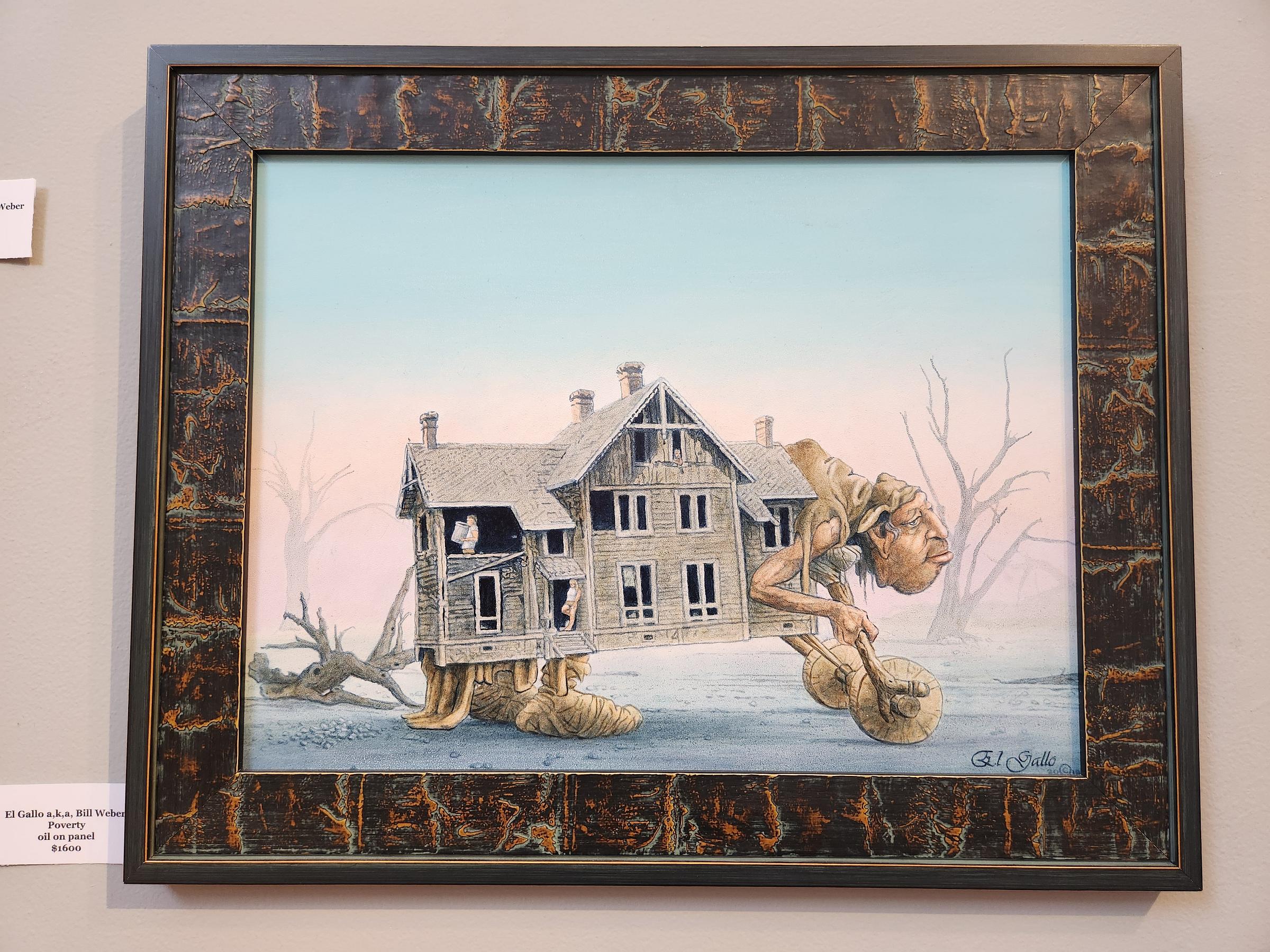 The gentle, broken being in “Poverty,” displayed as the 2008 pencil sketch below a 2010 oil version, limps forward on hobbled, bandaged legs, large eyes drooped and weary, bottom lip protruding. His painted jowls are smoother, softer, his weepy and furrowed face traded for a more contemplative gaze, exhausted but more at peace with his lot. His hunched, humped back crests just higher than the house it houses, but equally uneven, their slopes mirrored. His wheels are weathered, his shingled falling, his residents…resigned.