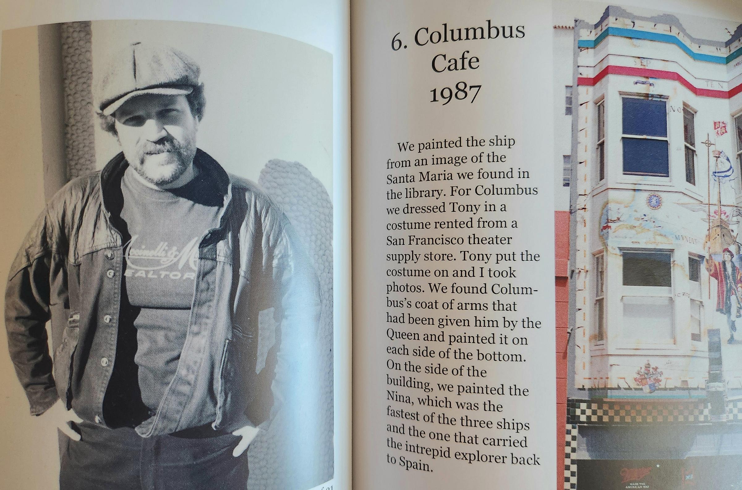 Weber the man is friendly and an easy talker. He shared the story of his breakout murals with little prompting, then pulled out a slim book and flipped it open to a black and white photo of a young man, shot in 1968. This was Giovanni Toracca, a local youth who had made a small fortune on his cherry bomb firecracker sales, and he had walls to paint. The two began a fruitful collaboration, with Weber designing and painting three highly visible locations around San Francisco for Toracca.