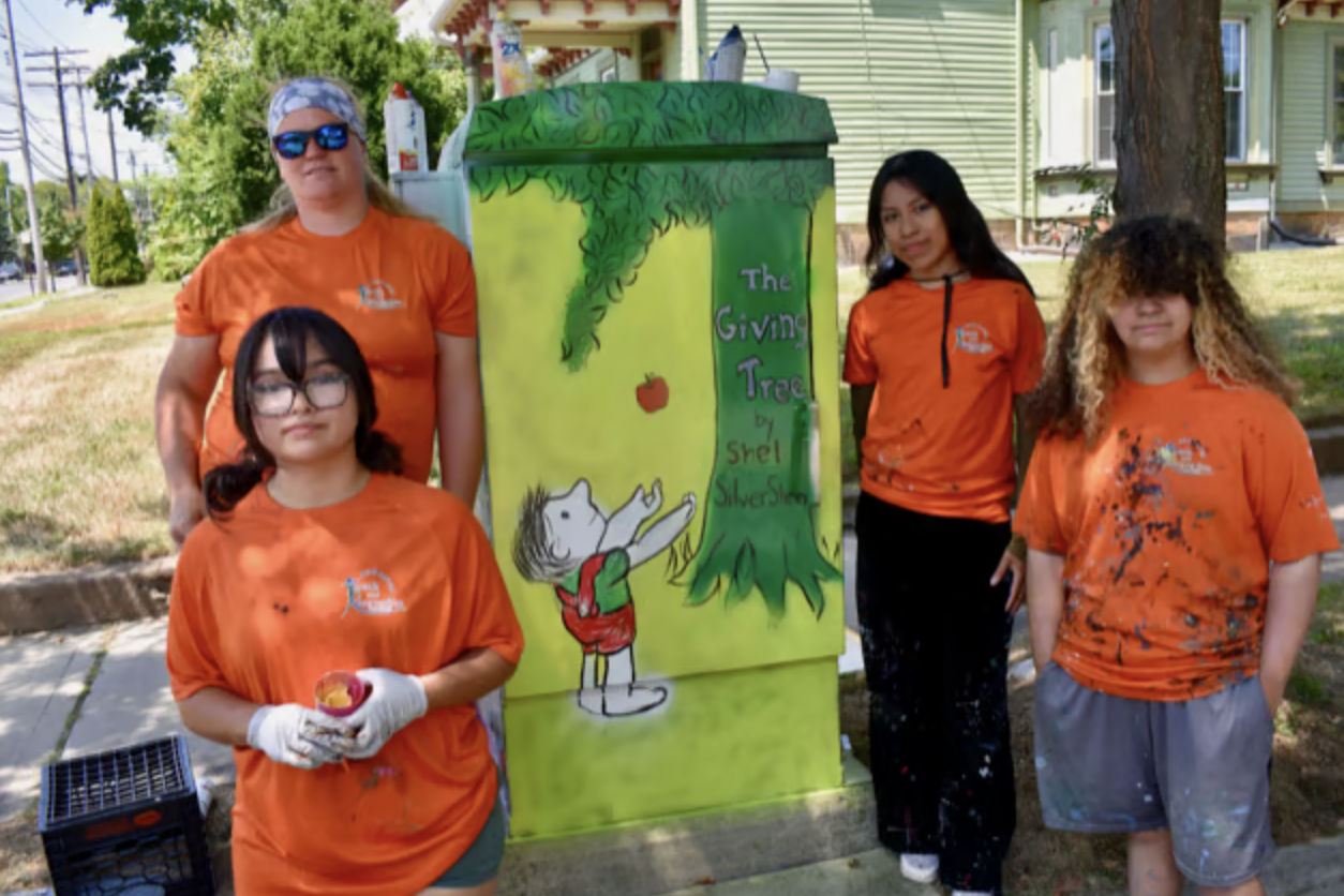 With spray paint bottles and brushes in hand, student artists Johana Perez, Bianca Gomez, and Siulmarie Santana brought to life their favorite childhood books — like Shel Silverstein’s “The Giving Tree” — as they decorated a graffiti-tagged electrical box across the street from Mitchell Branch Library in Westville.
