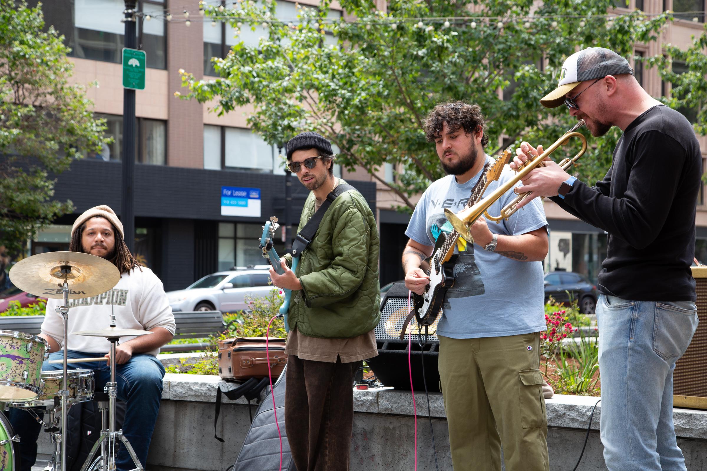 Intermittent sunshine broke through, illuminating four men in varying states of dress for the weather: one T‑shirt, one long sleeve, one sweatshirt, sleeves bunched up, and a bassist in sunglasses, corduroy pants, a beanie, and a down jacket. This is June is Oakland, and the men, all wielding musical instruments, were our weekly lunchtime serenaders of Latham Square, courtesy of Oakland arts grants.