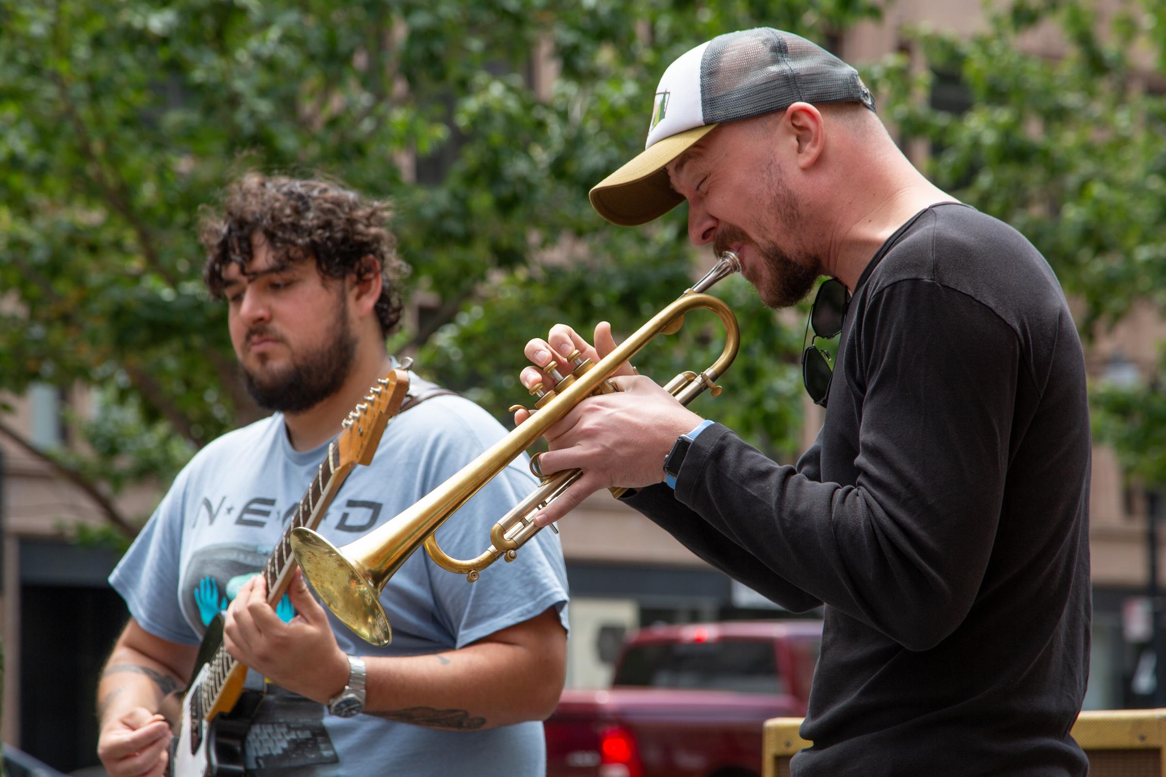 The group as a whole exuded a general sense of casualness, a laid-back vibe accentuated by the drummer’s rug and the quiet but silly banter between players. They moved through their songs at a languorous and easy pace, drawing in passersby on lunch breaks. Tables, then nearby benches, filled up with people, mostly solo, taking in the reverberations and soft blanket of tuneage. Two youngins armed with food joined my table, chatting quietly, their voices never reaching too far across it to me. A service dog at the feet of her owner, a few feet away, tiny blue bows on her harness beckoning for forbidden cuddles.