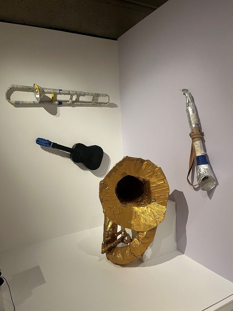 The rest of the show is no less fascinating as the pieces become larger and more complex. Ranging from paintings and ceramic sculptures to grand papier-mâché creations to an enormous site-specific installation, the art and its curatorship are remarkable. Perhaps my favorite pieces — amongst myriad other favorites — are those of Jonathan Velazquez. Velazquez constructs musical instruments using tape, chicken wire, cardboard and other materials, a sousaphone (“Tuba”), a trombone, a wind instrument, and a guitar, all carefully and painstakingly crafted. It is a perfect philharmonic arrangement. One can “hear” Velazquez’s music.