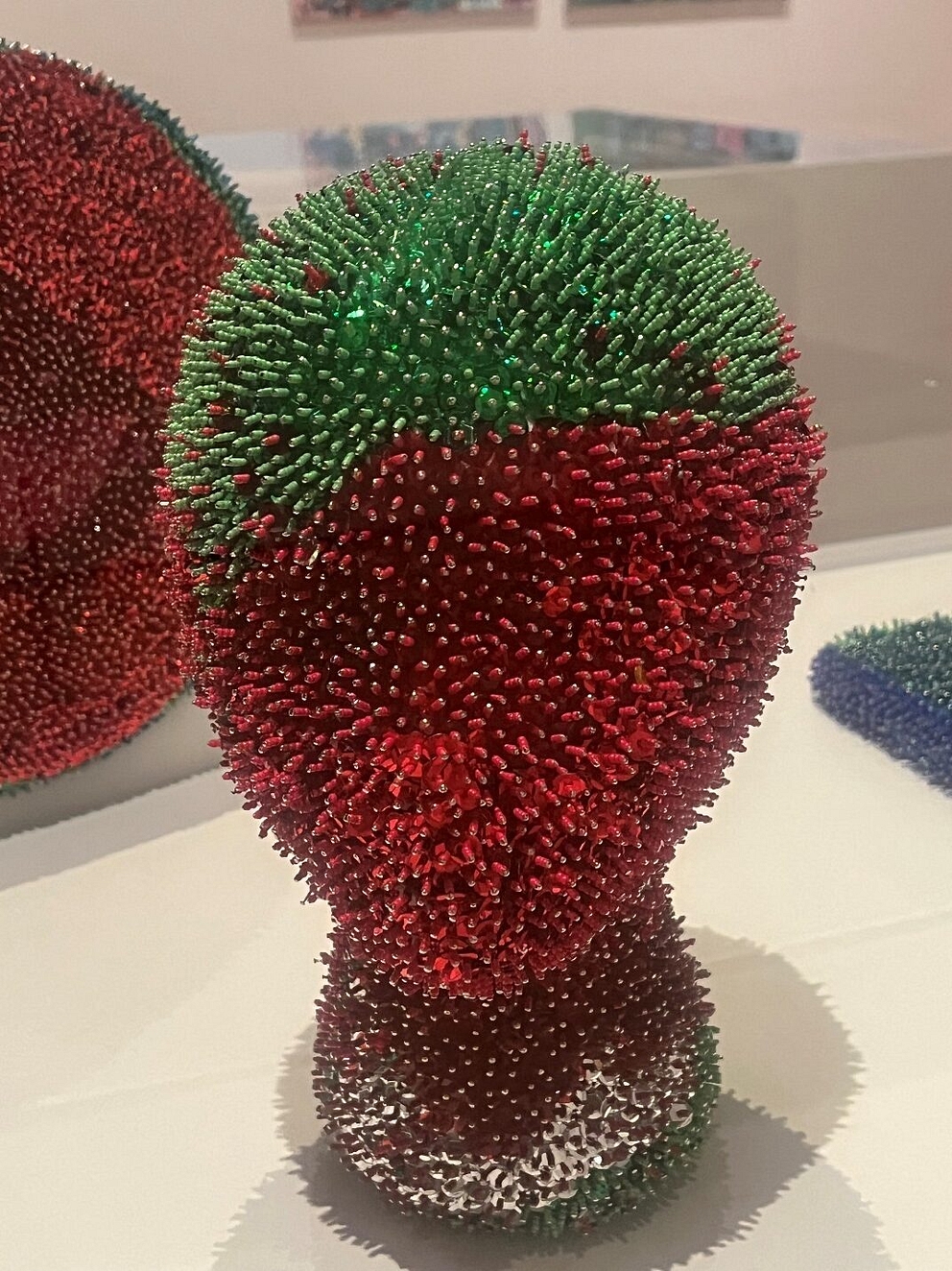 Another set of astounding pieces are by Monica Valentine. Despite her blindness, Valentine’s sculptures employ beads and sequins that are literally dazzling in the gallery’s lights: irresistibly optical, sure, but so much more stunningly tactile. One longs to touch them.