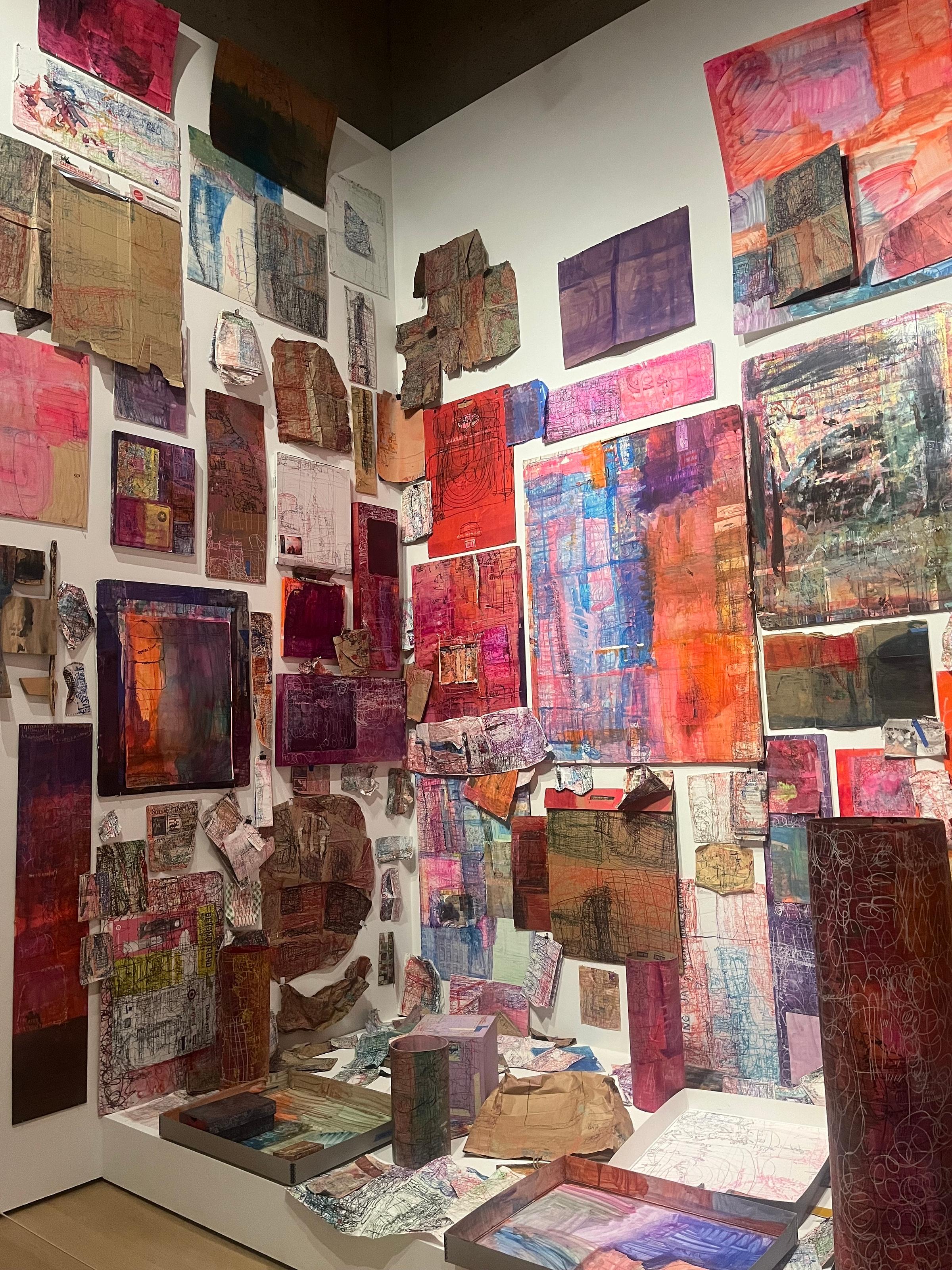 The first room features a floor to-ceiling grouping of small pieces hung salon-style. Most are typical of those one would encounter during a visit to one of the three workshops: colored pencil on paper, acrylic on wood, fabric and ceramic pieces, all of which create a mesmerizing constellation. One could easily spend an hour viewing these works alone.