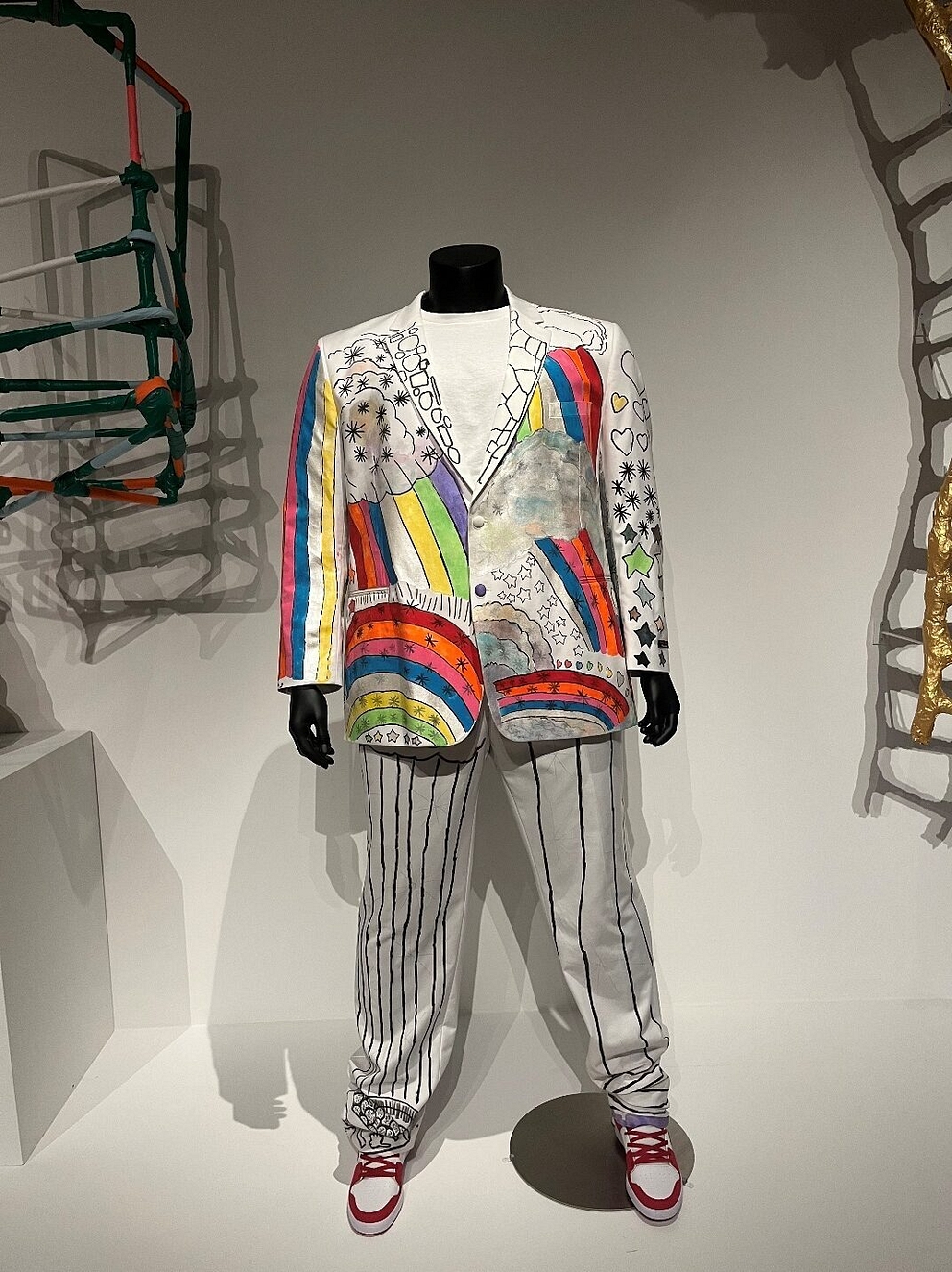 On the wall opposite, larger sculptural works are on view, including an eye-catching suit by Larry Randolph.