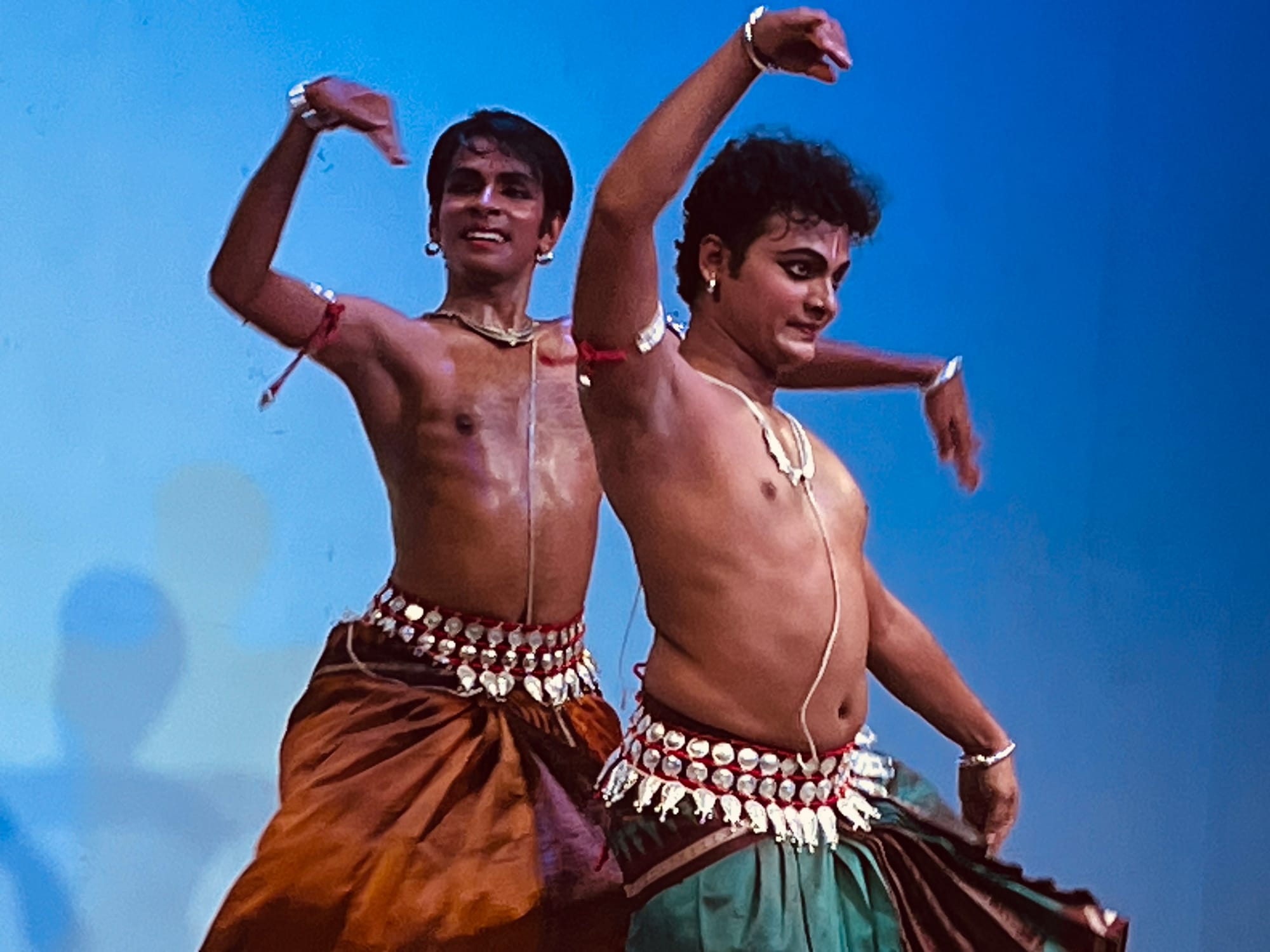 After the performance I asked to go backstage to chat with the dancers. I spoke mainly with the sweat-soaked and exhausted-looking Ram and Panigrahi. Samir Panigrahi, who is 29, began dancing at age 9; Santosh Ram who’s 30, at age 15. They both study under the guidance of their guru, Bichitrananda Swain who is director of the Rudrakshya Foundation. The two are now in residence with Odissi Vilas after performing in New York City in September at the Erasing Borders Festival, a prestigious Indian dance festival. The other dancers—Maureen Nandini Mitra, Manasi Padhi, Aparna Krishnamoorthy, and Gireeja Ranade—were warm and welcoming and I had a lovely time talking with them.