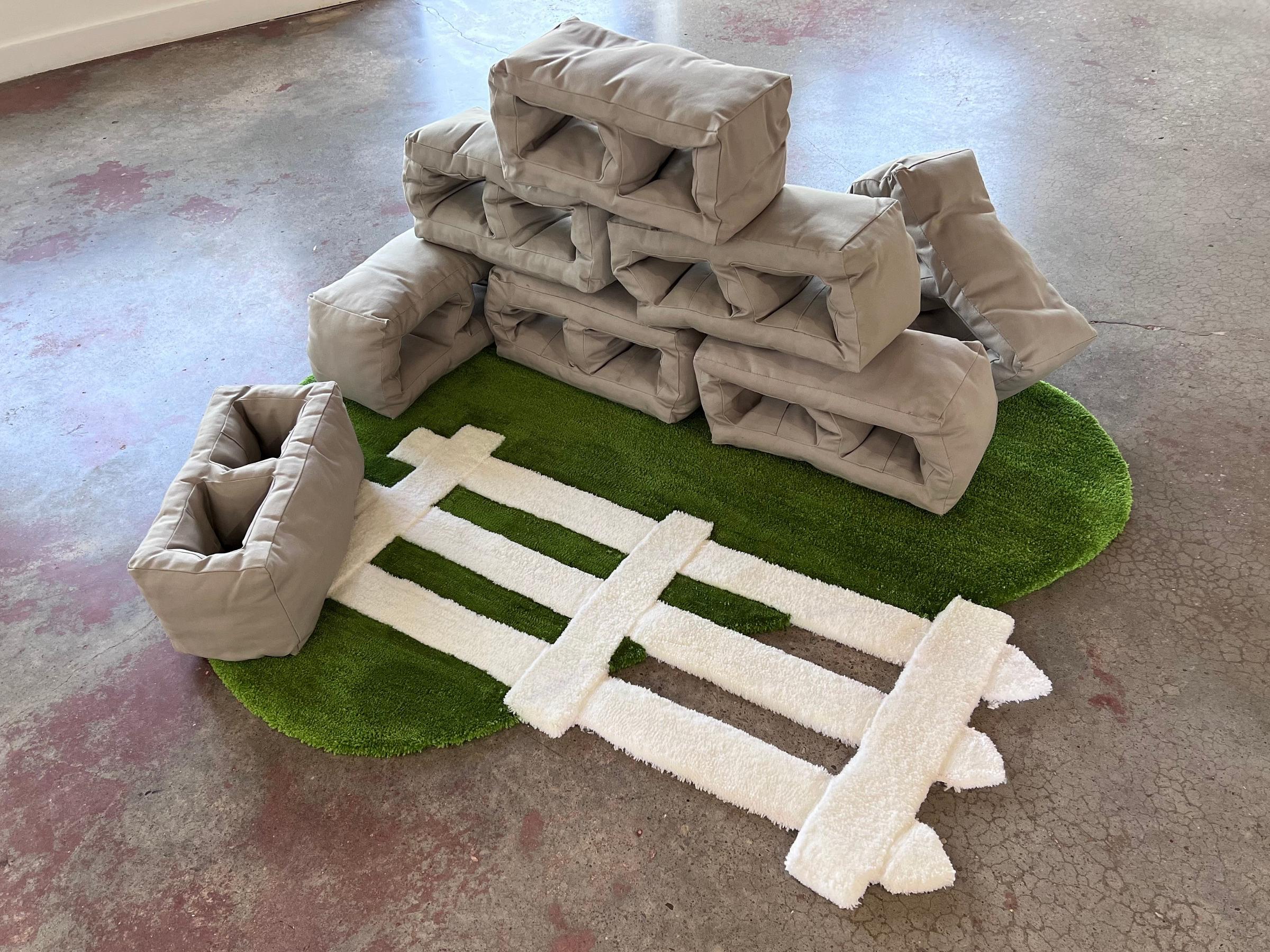 The vulnerability at the heart of Hughes’ bombastic humor is echoed in Cassidy Frye’s soft sculpture This Foundation Won’t Hold. Here, gray duck canvas is sewn and stuffed to resemble concrete masonry units and piled on a handmade rug. The rug depicts green grass on which a white picket fence, the defining symbol of Americana, has been leveled by an impossibly plush cinder block.