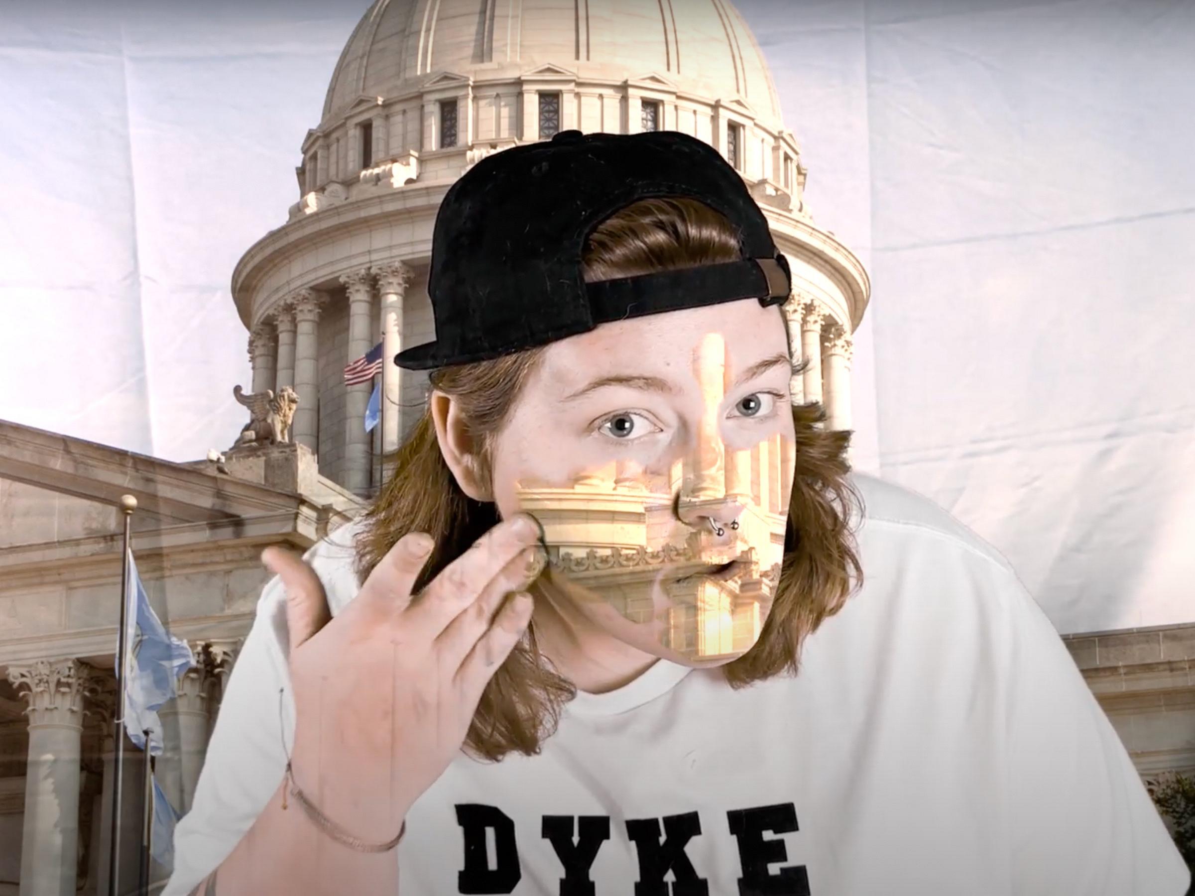 Conversely, artists like Zoey Hughes use humor to navigate exclusion and bias. In her video How to be a Lesbian in the South, Hughes performs skits illustrating actions like French kissing a blowup doll, eating baked beans out of a can, and the art of “blending in” (this involves Hughes casually smearing chroma key paint on her face until she disappears into the greenscreen behind her). Hughes’ self-aware irony softens the harsh realities of life in Oklahoma, where LGBTQ+ individuals still lack basic protections in schools, hospitals, and workplaces.