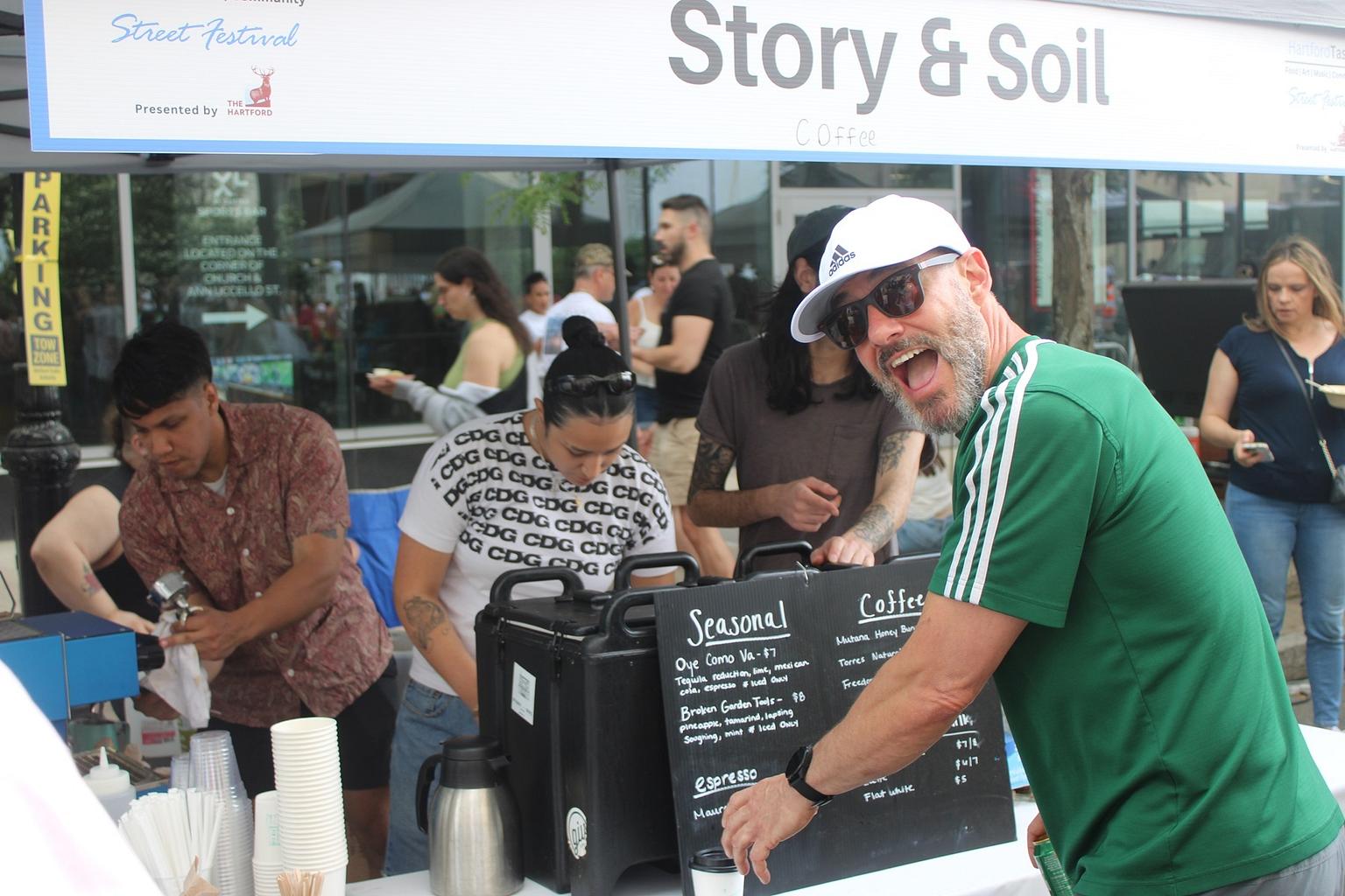 First I bumped into Len from Hartford. When I saw him, he was grabbing a flat white latte from Story and Soil’s tent. He had been out earlier going for a run with his group, Eight Six Go. After running through Elizabeth Park, he chose to come grab some food. He got the “Don’t Be a Jerk” plate from RastaRant, which normally operates in the Swift Factory in the city’s North End. He said he loves it when the city does events like this.