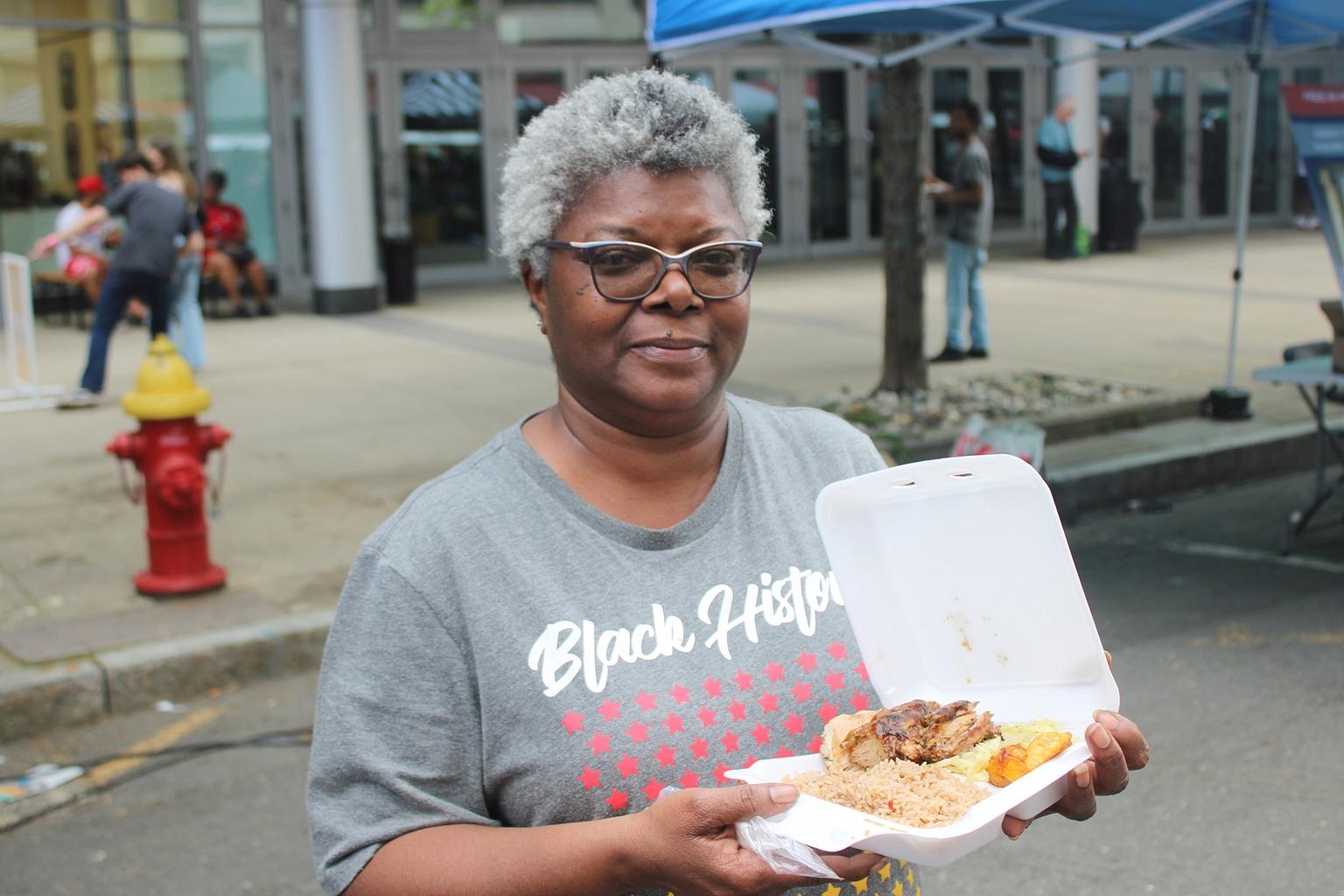 A few minutes later I bumped into my mother, who was also out and about to enjoy the festivities. She too had chosen to eat at RastaRant, choosing the jerk chicken, rice and peas, cabbage and plantains.