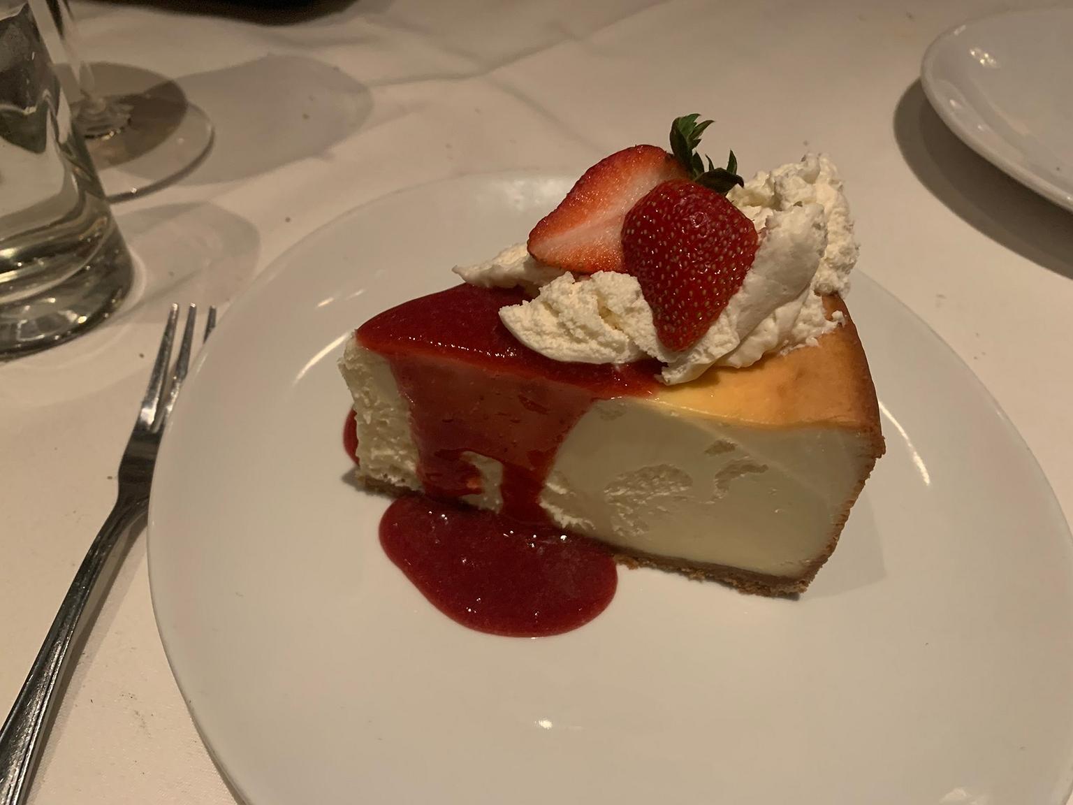 The evening ended with cheesecake covered in strawberry wine sauce. It was exactly as decadent as I hoped, with a thickness to the cake that meshed well with the thin, crunchy crust that cradled it. The wine sauce was good, but a little too strawberry-flavored, so I mostly ate around it.