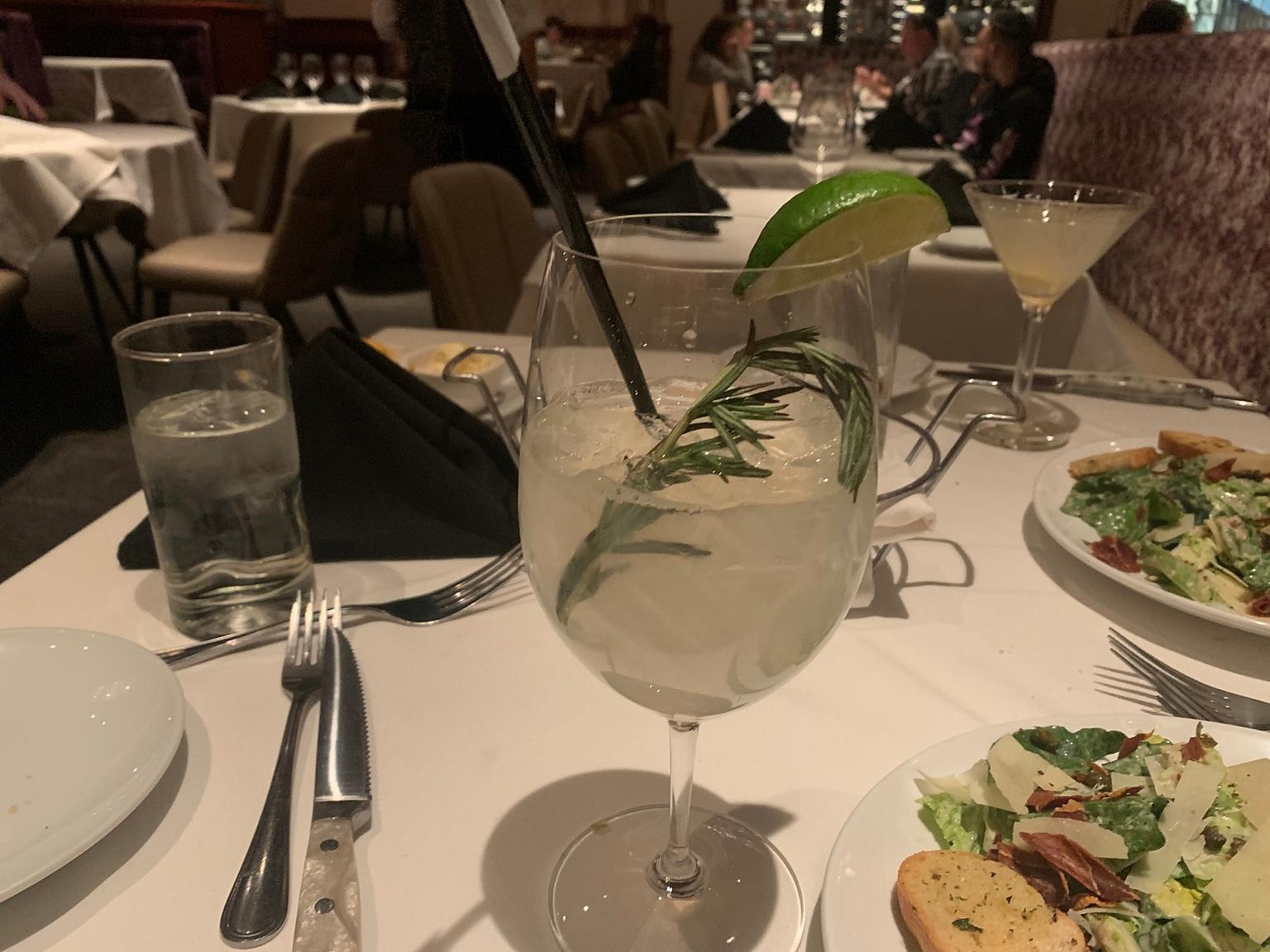 I ordered the Socal V&T to start. It’s a drink made with Absolut Elyx vodka, craft tonic, California seasonal herbs and ripe fruit. While the herbs looked cool in the glass, I noticed that there was no fruit to be seen, other than a lime wedge. The drink ended up tasting like Mountain Dew, which isn’t objectionable, but not what I was expecting from an alcoholic cocktail.