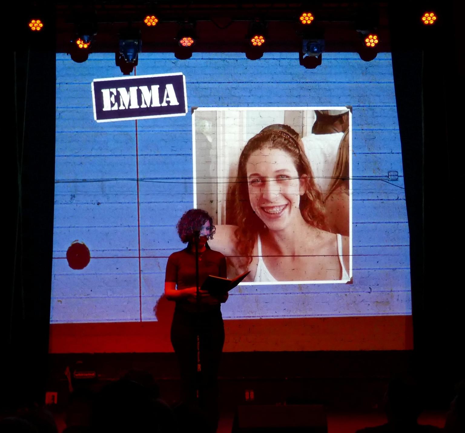 Emma, who was 16 in 2002, told the crowd that, at the time, she was eager to prove wasn’t a “priss.” She read from her teenage diary, declaring, “I smoke, I get drunk, I give BJs, I give HJs, I wear dark eyeliner in the summer… Welcome to the new me.” The crowd roared in approval. But the reality she recounted in her diary is also honest and endearing. After her first time, she wrote, “When he asked me if I climaxed, I said I didn’t know.” You could practically hear the confused teen behind the words of the self-assured adult. After loud cheers, Emma proudly thanked her family and friends who showed up.