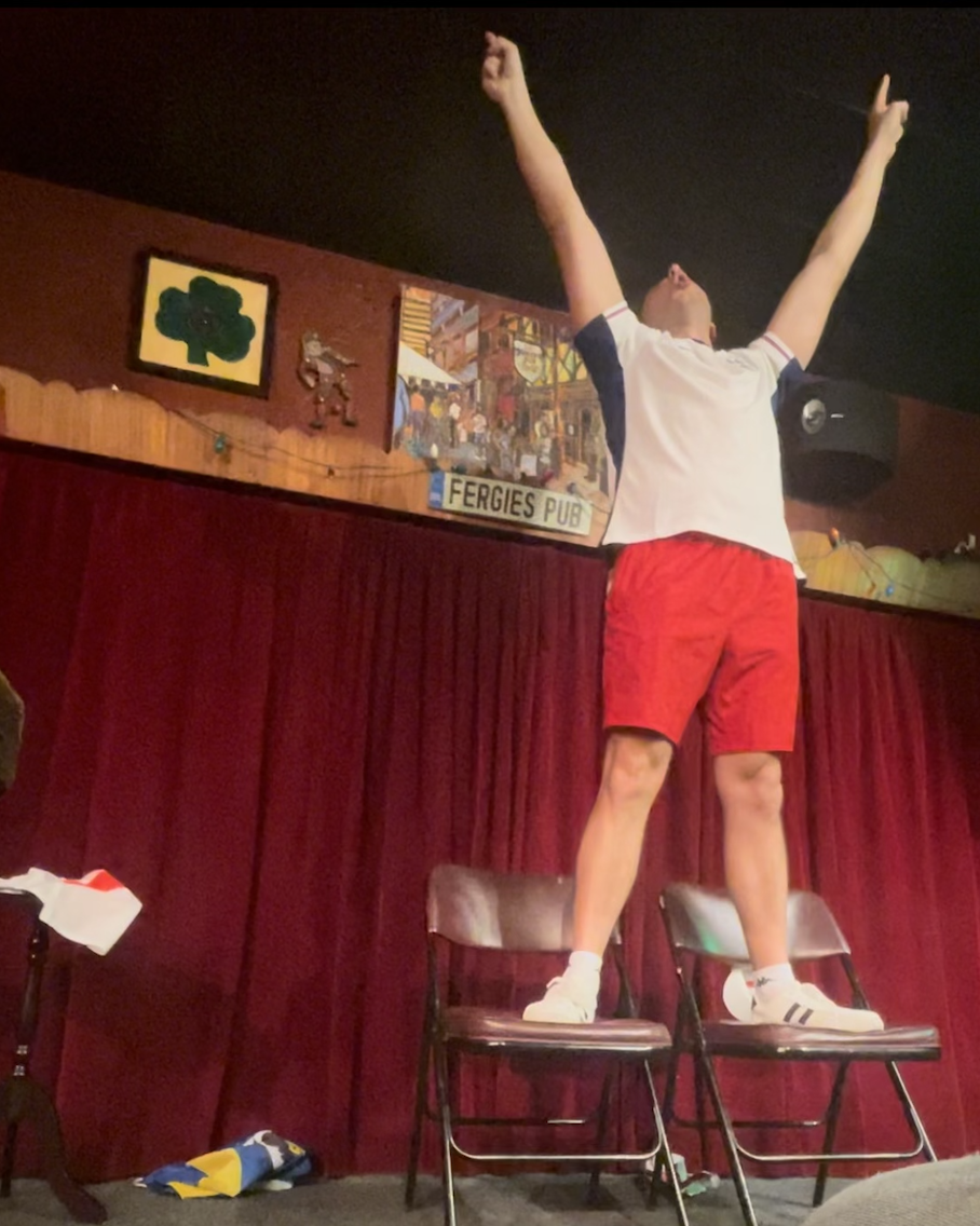 We’re sitting in a pub when a young man clad in English football merch stands up and starts shouting at the crowd. He begins chanting, clapping, and making crass jokes at the audience. He gets up on stage and drops his pants and yells, “this flare is going up my bum cause it’s fun!”