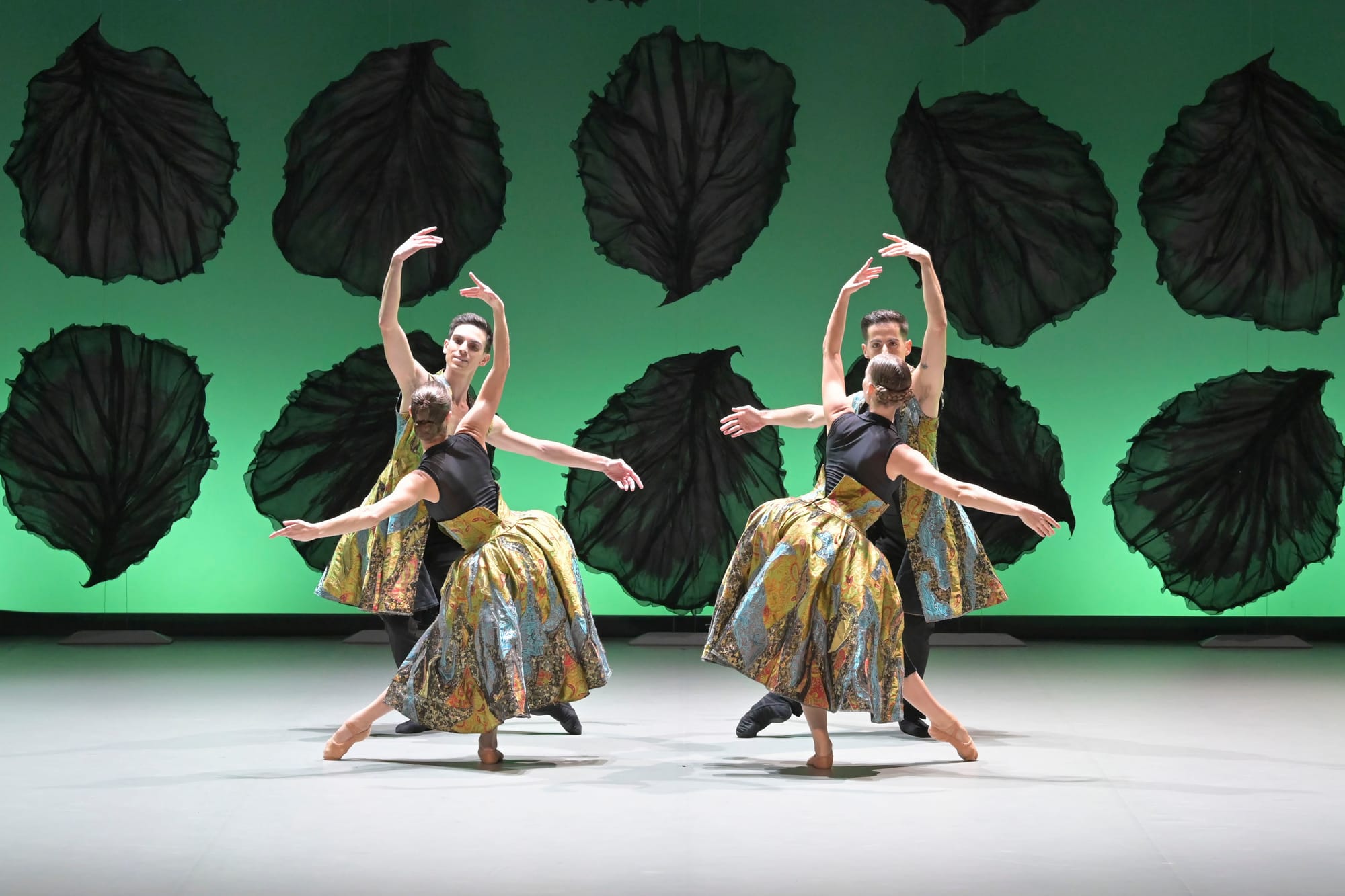 The black leaf backdrop, while relatively simple, enclosed and complemented the movement perfectly, creating a heightened drama. It paired with the flowing, black wings the dancers wore on their arms, emphasizing their connection with nature and the divine.
