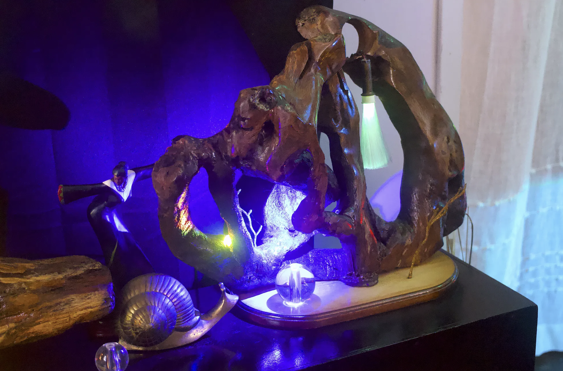 The night before, White had stayed up until 1 a.m. working on a smaller horizontal piece that now sat next to the lamp. Colored lights reflected off the interior of the cave-like structure, and two tiny elephants took a walk along the rim.