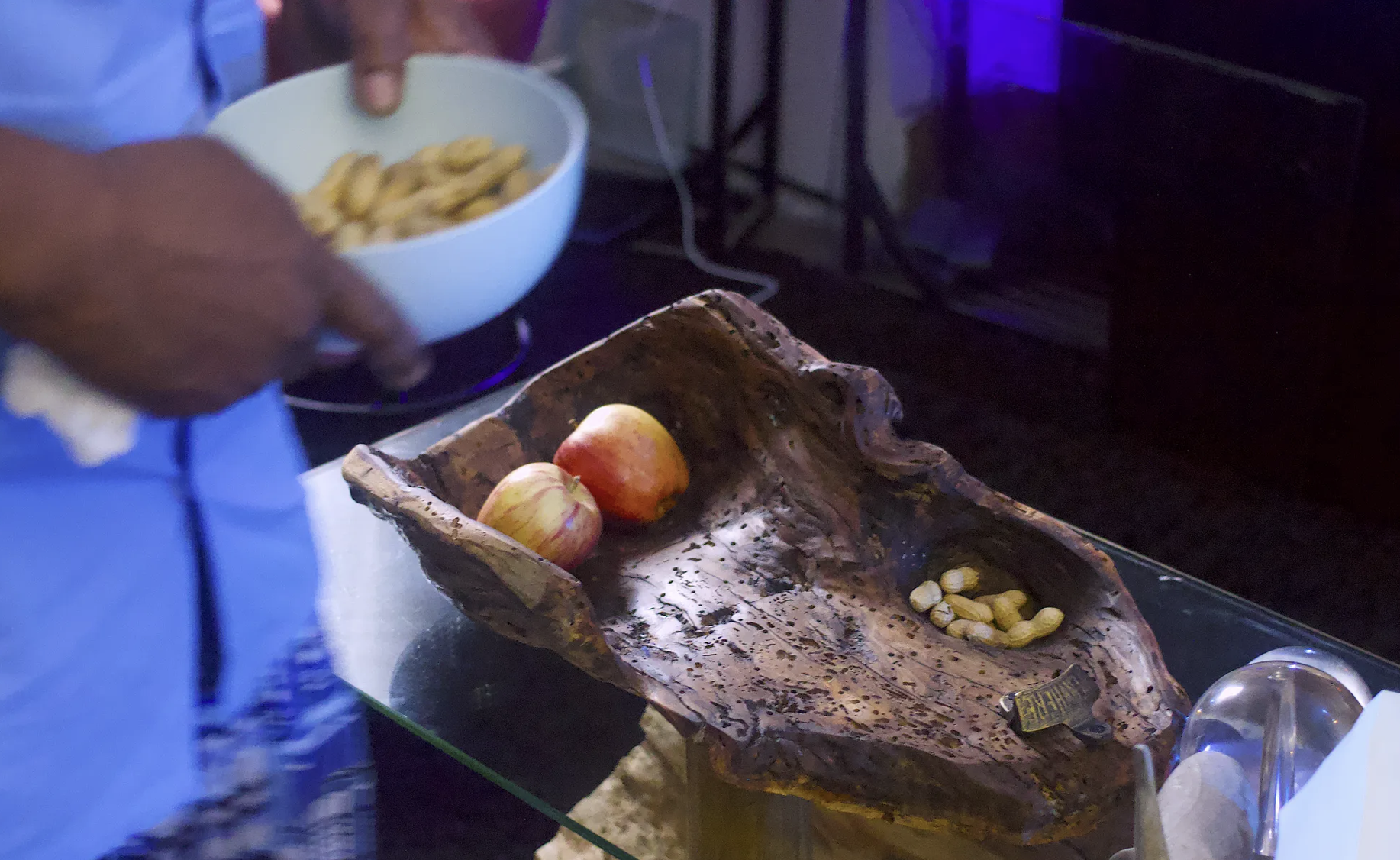 Before I knew what was happening, he had placed a couple apples in the bowl and was tossing peanuts in as well.