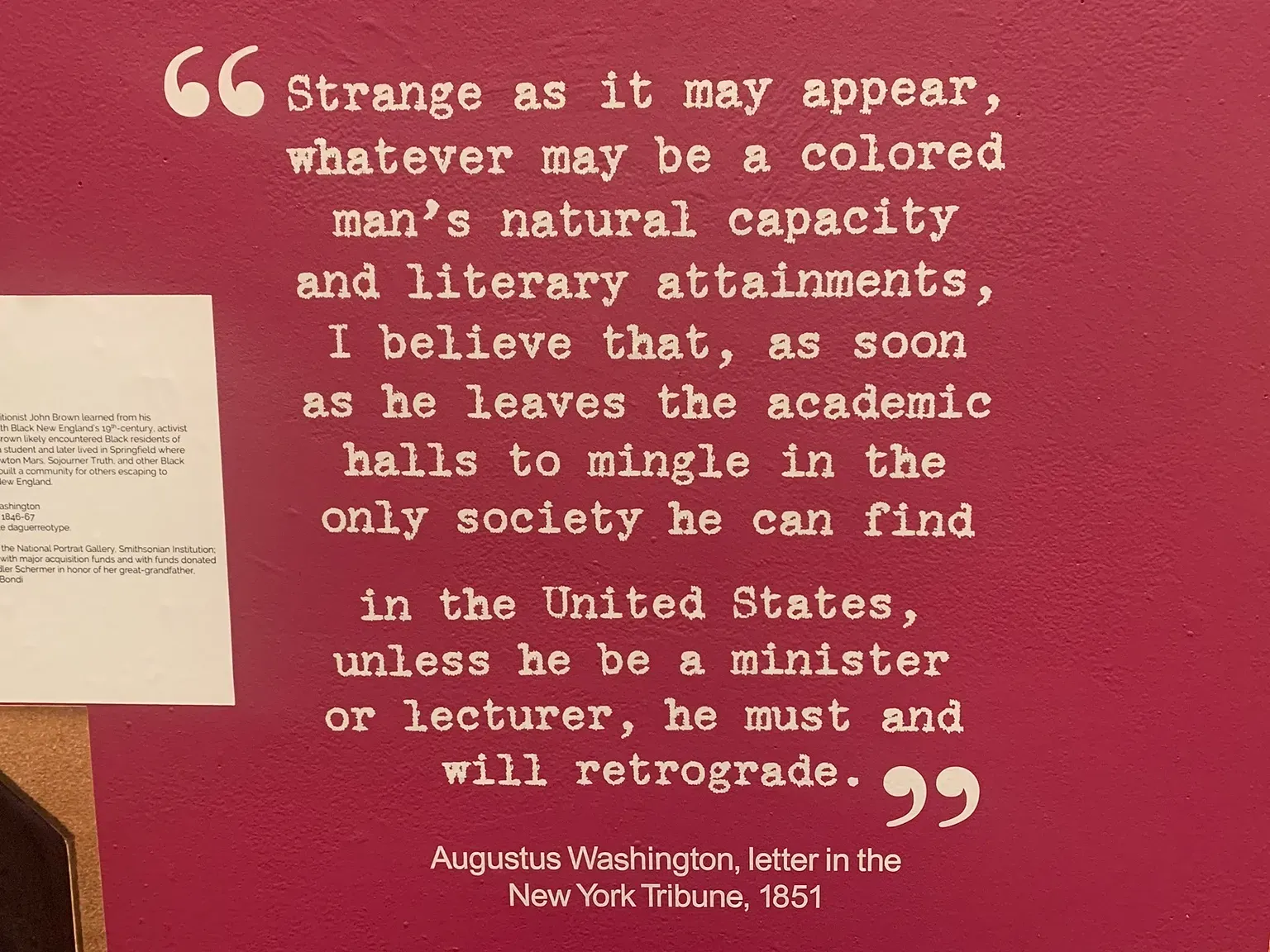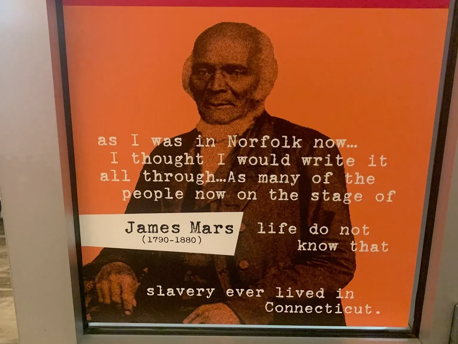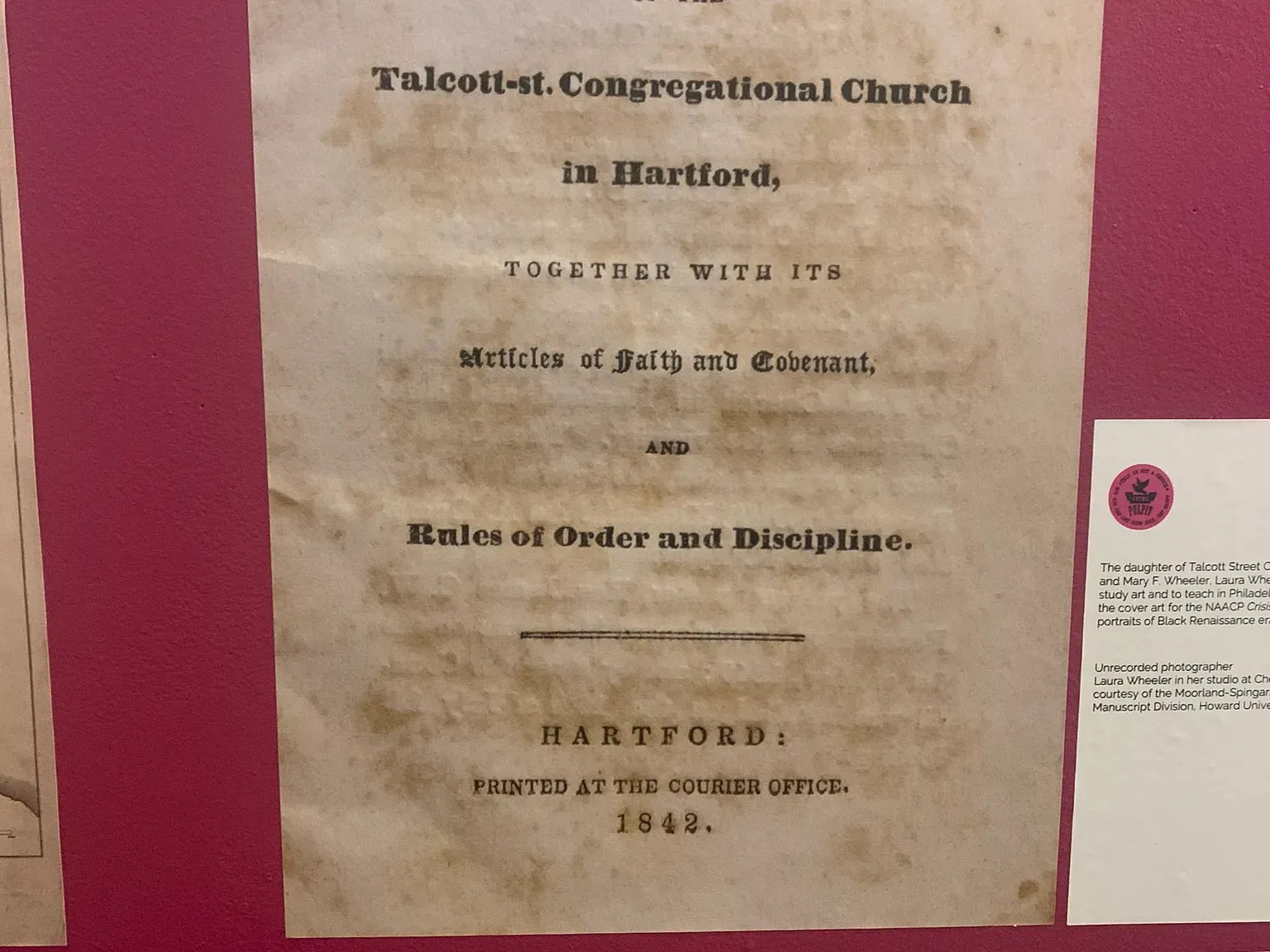 The exhibit is a beautiful display of the impact of some of Talcott Street’s most famous members, highlighted in bright orange and magenta hues. It’s also primarily text based, taking quotes from members and other Black Connecticut residents to show visitors, in their own words, what it was like to be Black in the Nutmeg state in the early 19th century.