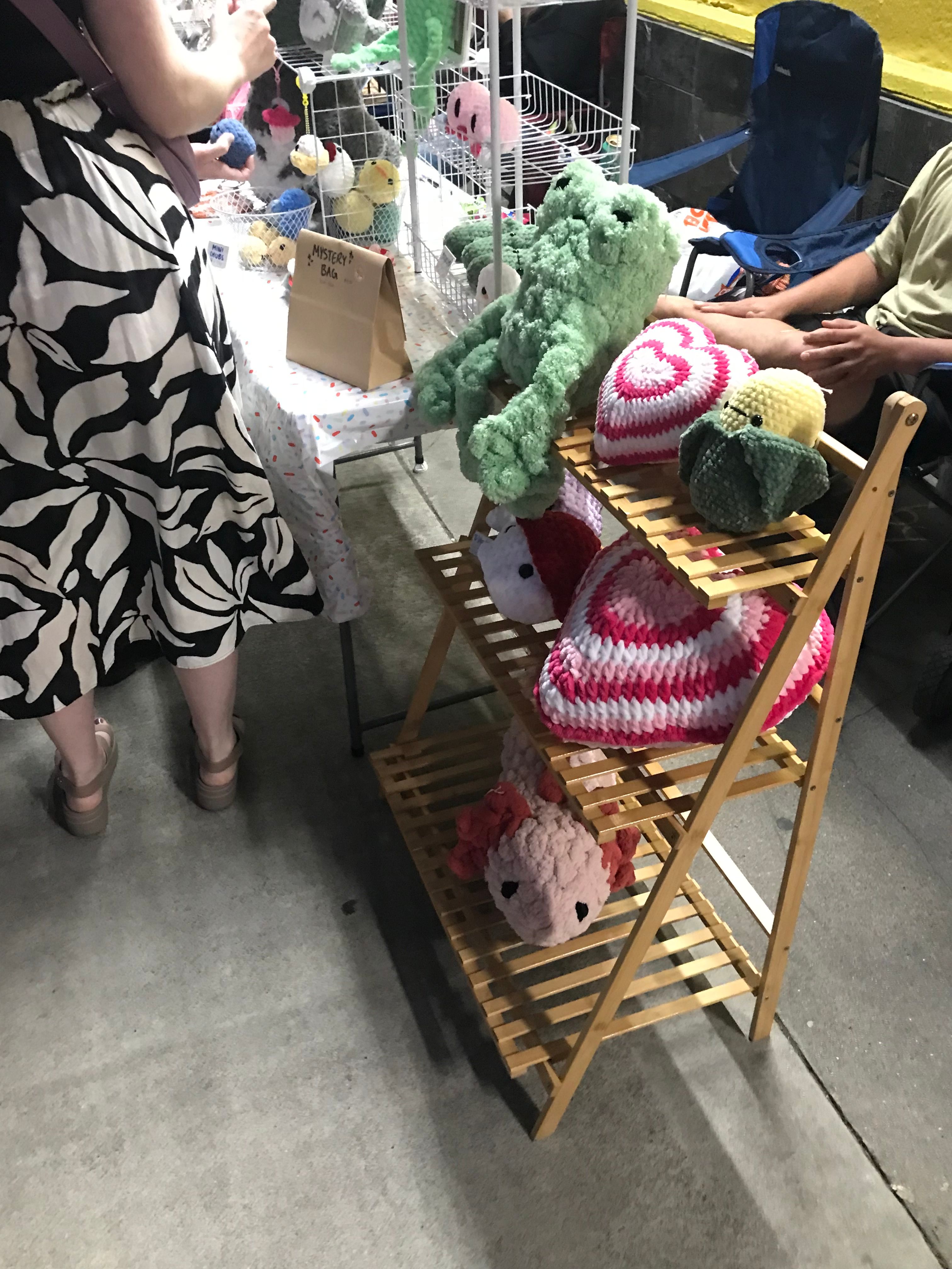 Other caricatures punctuated the evening: eccentric flipper of Garbage Pail Kids cards; unshowered dude wielding dead reeds fashioned into a kitana and sai, grumbling to himself while darting into traffic; unamused mafia wife – type with her stocky partner, who overconfidently illustrated his projected arm circumference after getting swole (my mnemonic for him was Bicep Boyfriend). Intl Players Juice brought jokes to their cart with hip-hop puns like “A Tribe Called Fresh,” and the kawaii kids at chubby pals.co contributed immaculately crocheted axolotls. Clearly, everyone is welcome at Fourth Fridays.