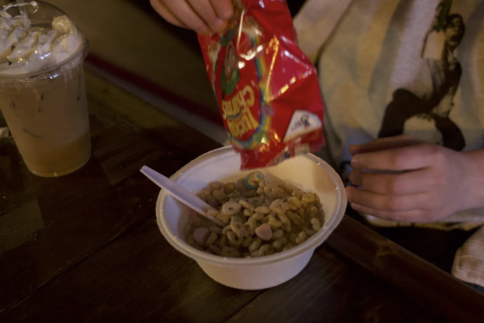 Perfect serving-size packets of Cinnamon Toast Crunch, Corn Pops, and Lucky Charms nestled up among Pop-Tarts and a large glass pitcher of milk by the TV screen. “When they said ‘bad cereal,’ I thought they were going to have off-brand shit,” said Bessie Flores Zaldívar, one of the grown-ups in attendance. “This is … good cereal.”