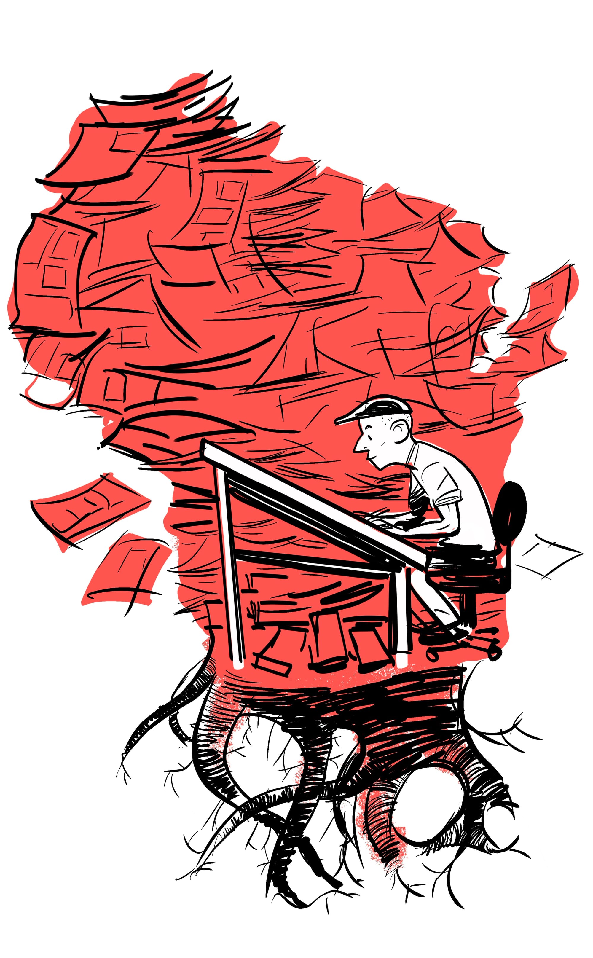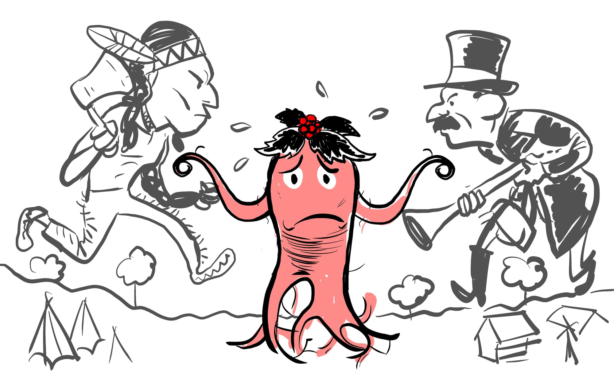 There is a preciousness to Thompson’s technique that can come across as cloying, particularly with his childhood self. That preciousness darkens into a glib, Disneyfied sensibility with his depictions of indigenous people. While no detail was spared in depicting the undeniably harsh realities of a childhood spent at work, Thompson condensed two centuries of brutal colonialism into ten pages with the white-washing efficiency of a three minute School House Rock. The book is black and white with a red spot color. Those ten pages should be drenched in red, but they are unbloodied.