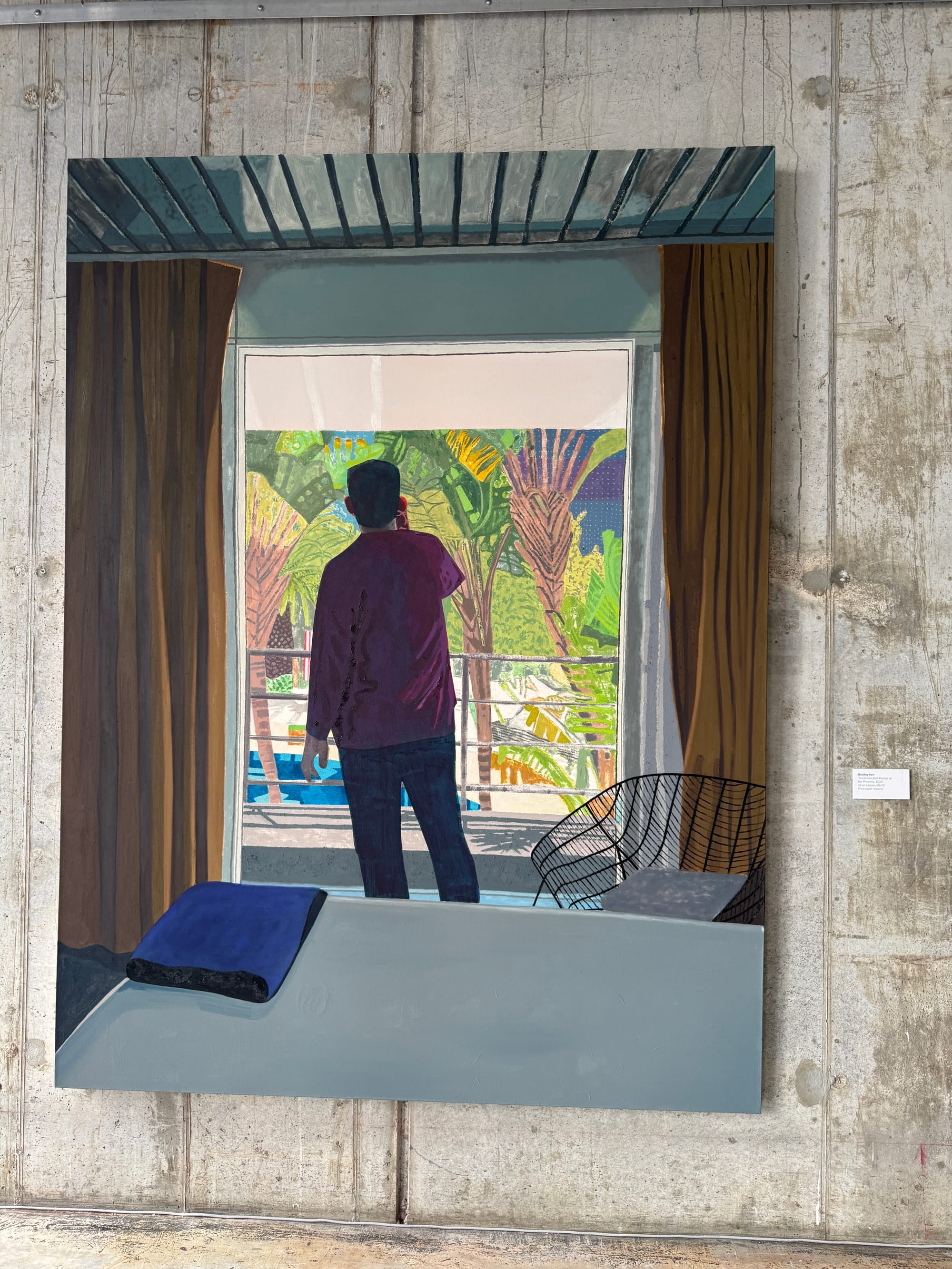 In “Tenderloin (Self-Portrait at the Phoenix)” (2020), Kerl paints himself standing in a plain bedroom, looking out the window at the foliage outside. The most striking part is the way that light feels like it’s coming off the canvas. The room is dark but the world outside looks like it’s almost glowing. The foliage is a little larger than life, the pool’s water is a hyper saturated blue. It’s not what lockdown looked like, it’s what lockdown felt like – that the real world was so close yet so far away, and what used to be normal suddenly looked almost magical. Similarly, Kerl’s “SLAT (Mr. Chuck’s Falcon)” shows a fence with what is presumably a red car through the gaps between fence boards. Due to the light and color choices, the emphasis is on the part we can’t really see all of, and not what seems to be the main subject of the painting at first glance.