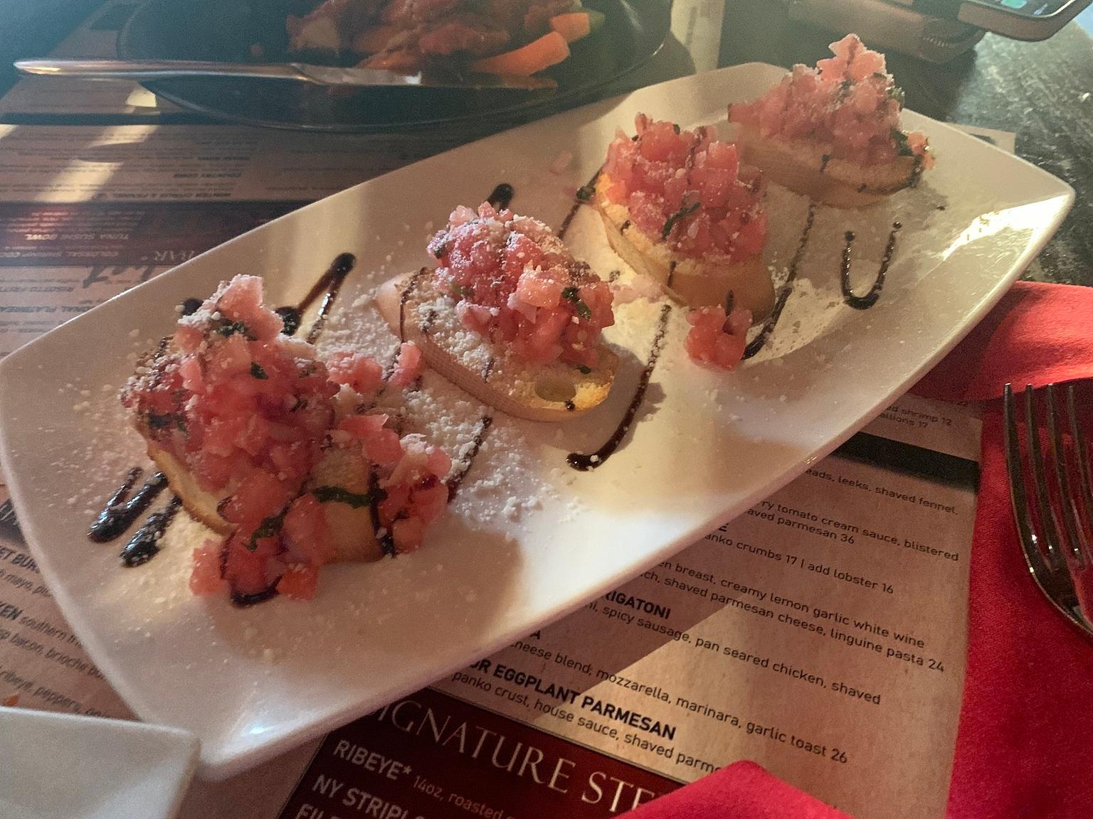 Shortly after I finished, the waiter brought out the tomato bruschetta crostinis (can you tell I love tomatoes?), a dish consisting of fresh diced tomatoes with garlic, basil, a dusting of parmesan cheese and balsamic drizzle. The softness of the tomatoes was a great contrast to the crispy bread, and the zesty flavor of the ingredients made the bruschetta a very close second to the soup.
