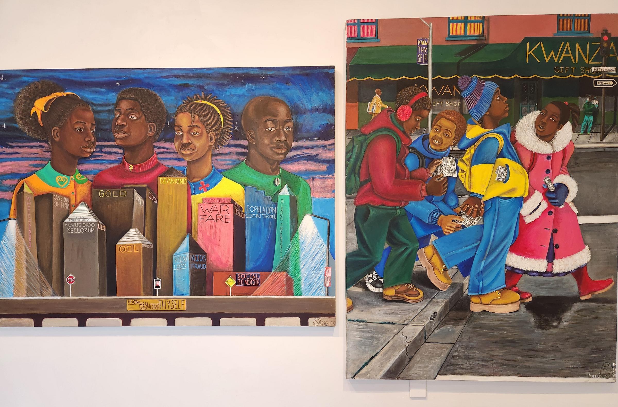 Their depictions are part of the “Forever 14 Series,” a dozen of 44 works by featured guest artist Malik Seneferu. His exhibit, Press Play: Remain Creative, arranged by guest curator Karen Seneferu, occupies the entirety of the front gallery at Gearbox. His decisive strokes in bright acrylics offer a welcoming beckon from a rainy gray afternoon on a grimy corner of Grand Avenue.