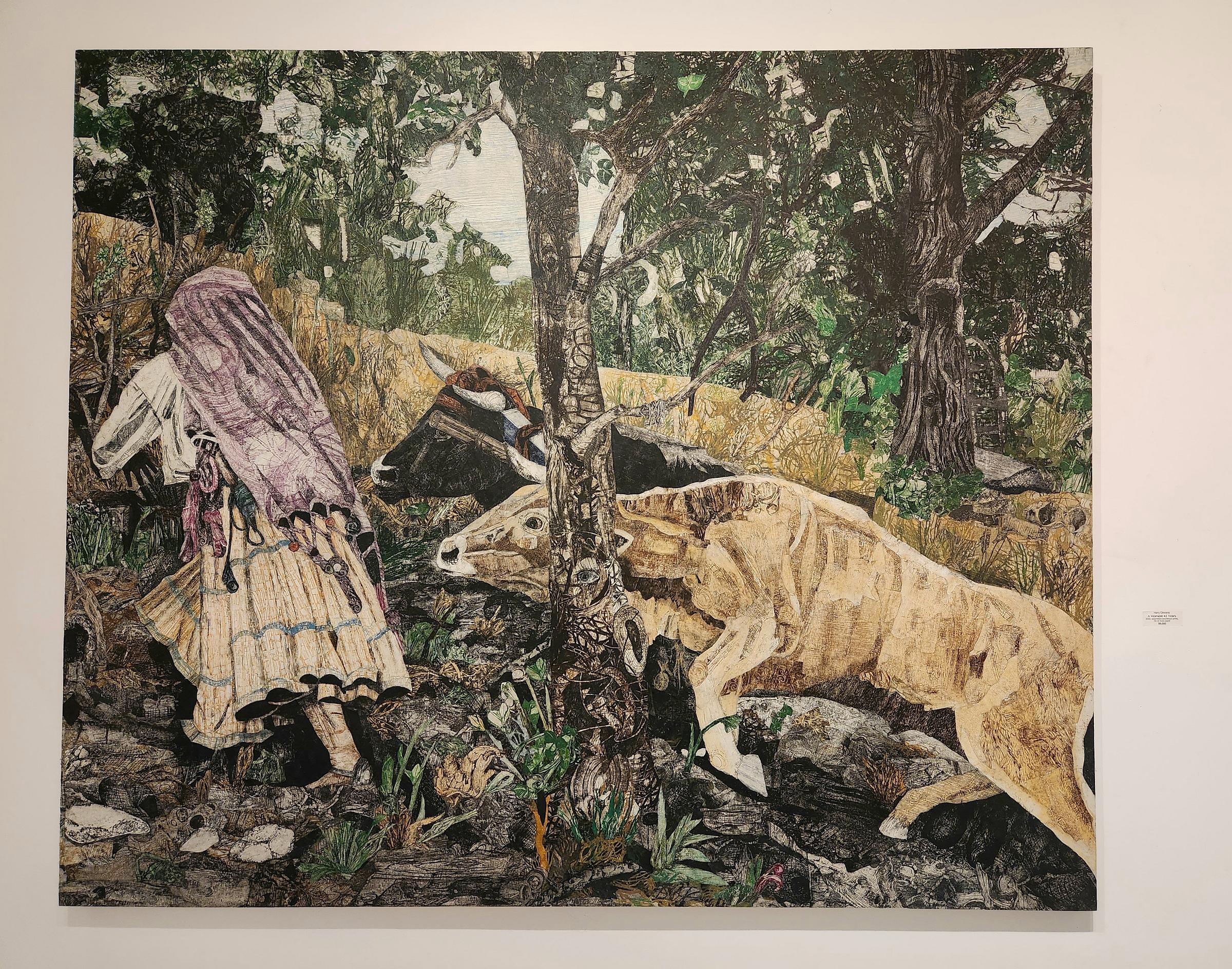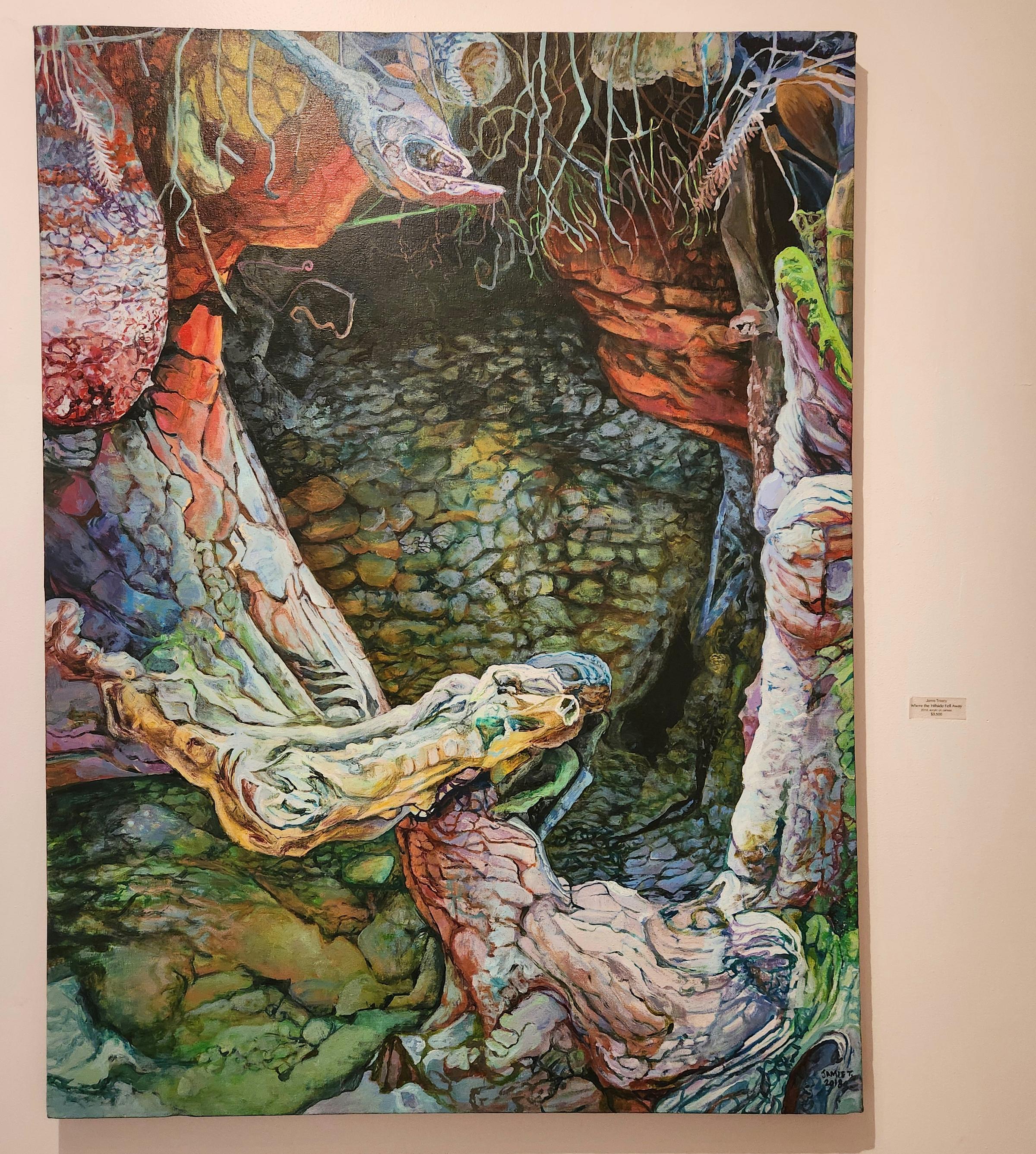 Overall, though, despite my having spent far more time examining Senedferu’s work, the pieces I liked best were all squished neatly into three tiny mini-exhibits at the back of the gallery, and all came from member artists at the gallery. These included Harry Clewans’ “A Moment 43 Years” and Jamie Treacy’s “Where the Hillside Fell Away,” a trippy water nature scene. With its dappled light and warm, near-neon hues, gecko-coded branches and suminagashi-esque watery stones that sweep through the center of the piece, gurgling, Treacy’s painting has a pleasing palette and comforting softness.