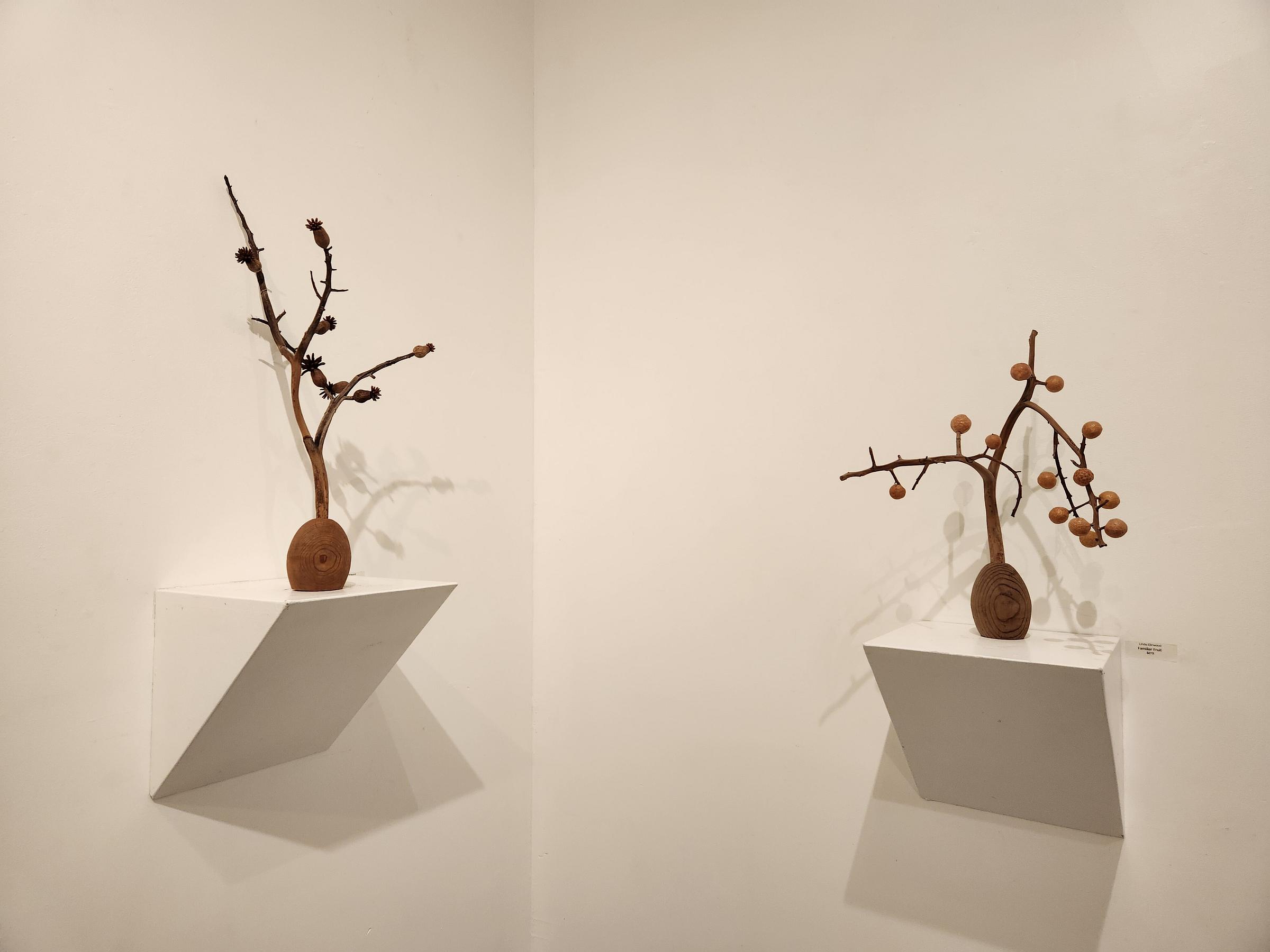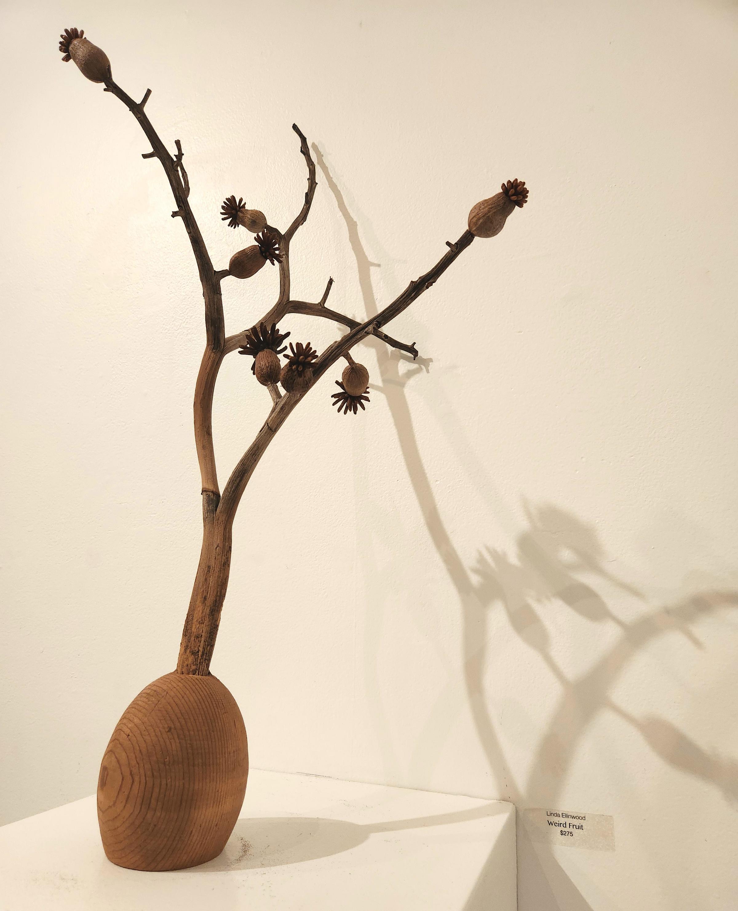 Linda Ellinwood’s “Weird Fruit” and “Familiar Fruit” immediately spoke to me, their supernatural forms contorted and warped beyond reality while remaining firmly within this realm. Built of wooden buoys, found twigs, and other tree bits such as eucalyptus “gumnuts” and unknown spiky and rounded pods, respectively, these small sculptures are forged to create a cute alternative to “natural” as we know it. Bonsai built of dead twigs and mismatched genuses, unadorned adornment.