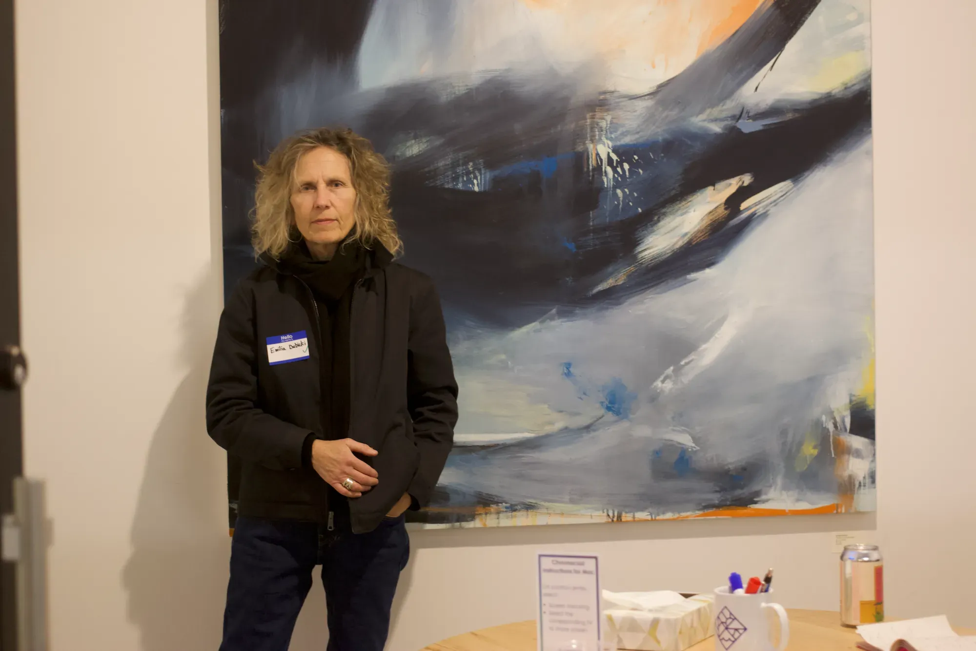I cozied up inside as information poured through the glass walls and open door. Org president Ryan Dings announced Climate Haven would expand in April, building out 7,000 square feet of space for incubation and innovation. To my right, the gray-blues and whooshing strokes of Emilia Dubicki’s abstract oceanic painting “Chasing a Summer Night” told a tale older than us all.