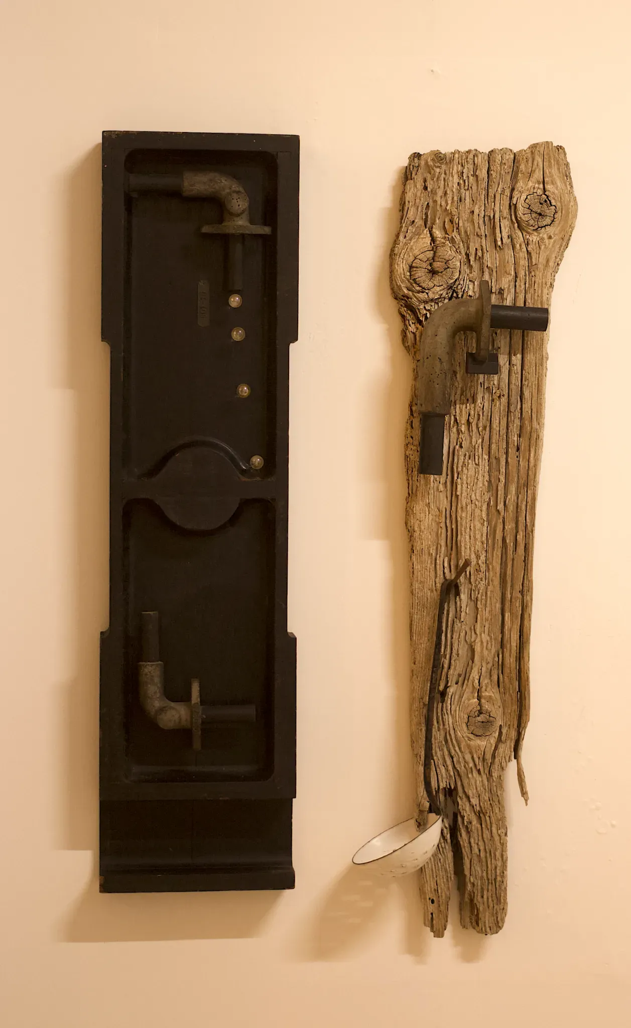 His title for the work across from that one (and a decade and a half older than it) was even trippier. The piece was a diptych, with casting patterns from a foundry, pipes, and glistening baubles of “water” flowing from one half to the next. Madasci remembers putting it together: “I had the sense that there was something missing.”