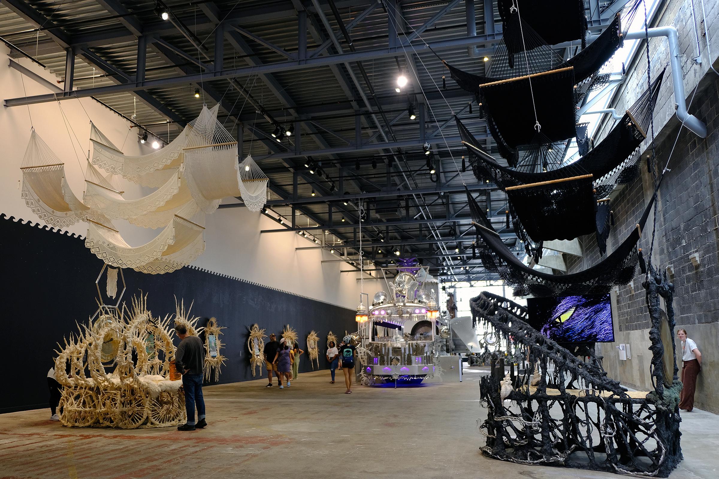 The first bed, in black, has black hammocks crisscrossing on top of it up to the ceiling. A gong is on one side of it and the squinting eye of an animal (or perhaps a sinister monster, or perhaps Toothless from How to Train Your Dragon) glared out of a screen incorporated into the sculpture. (This turned out to be footage of Maravilla’s cat, Wifi, which I love). Twisted into the vine-like structure are large sea shells, plastic avocados, coin purses, crystals, and other objects collected during trips retracing Maravilla’s migratory route. As if its exact counter, a second similar structure in white is across the room from the black one.