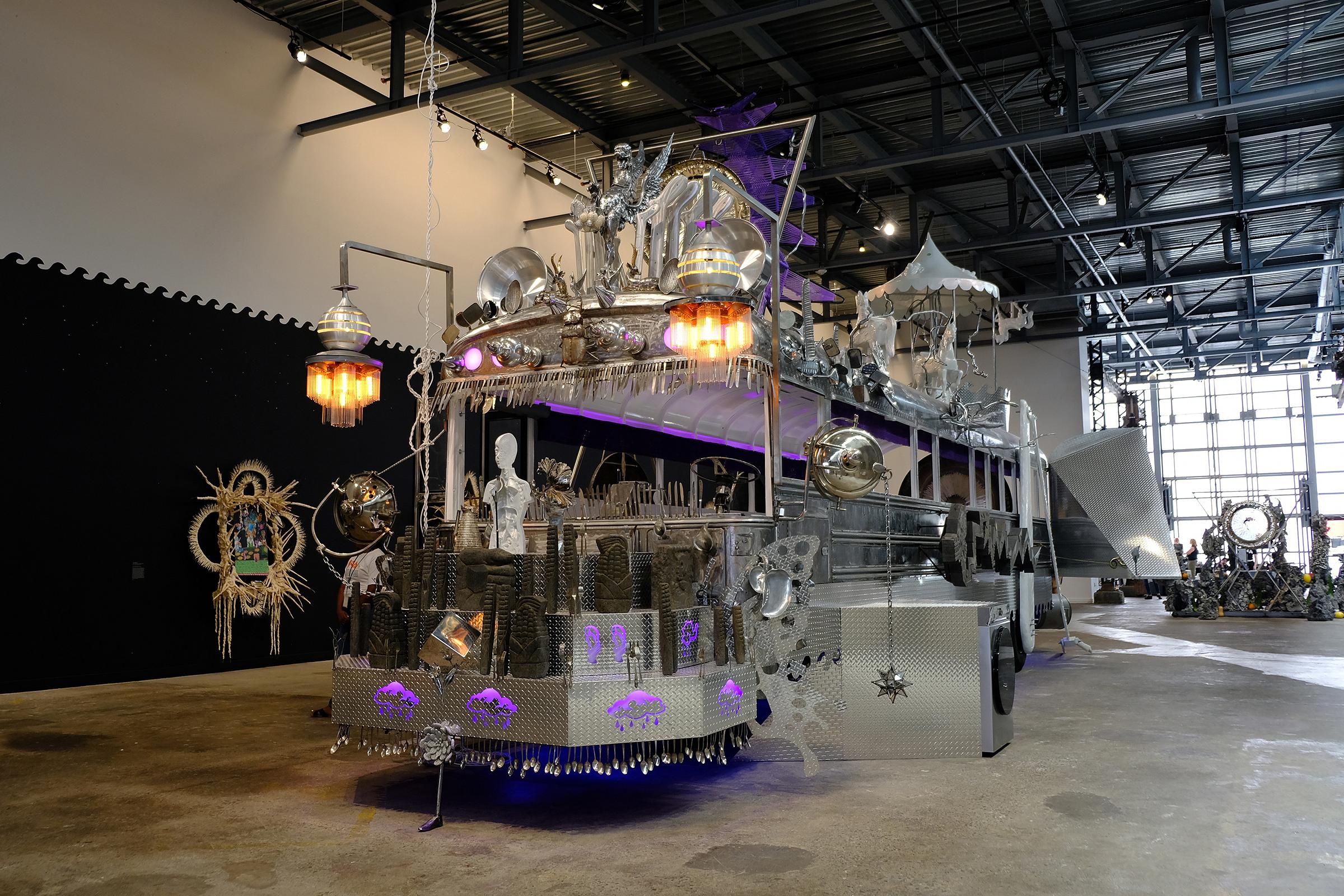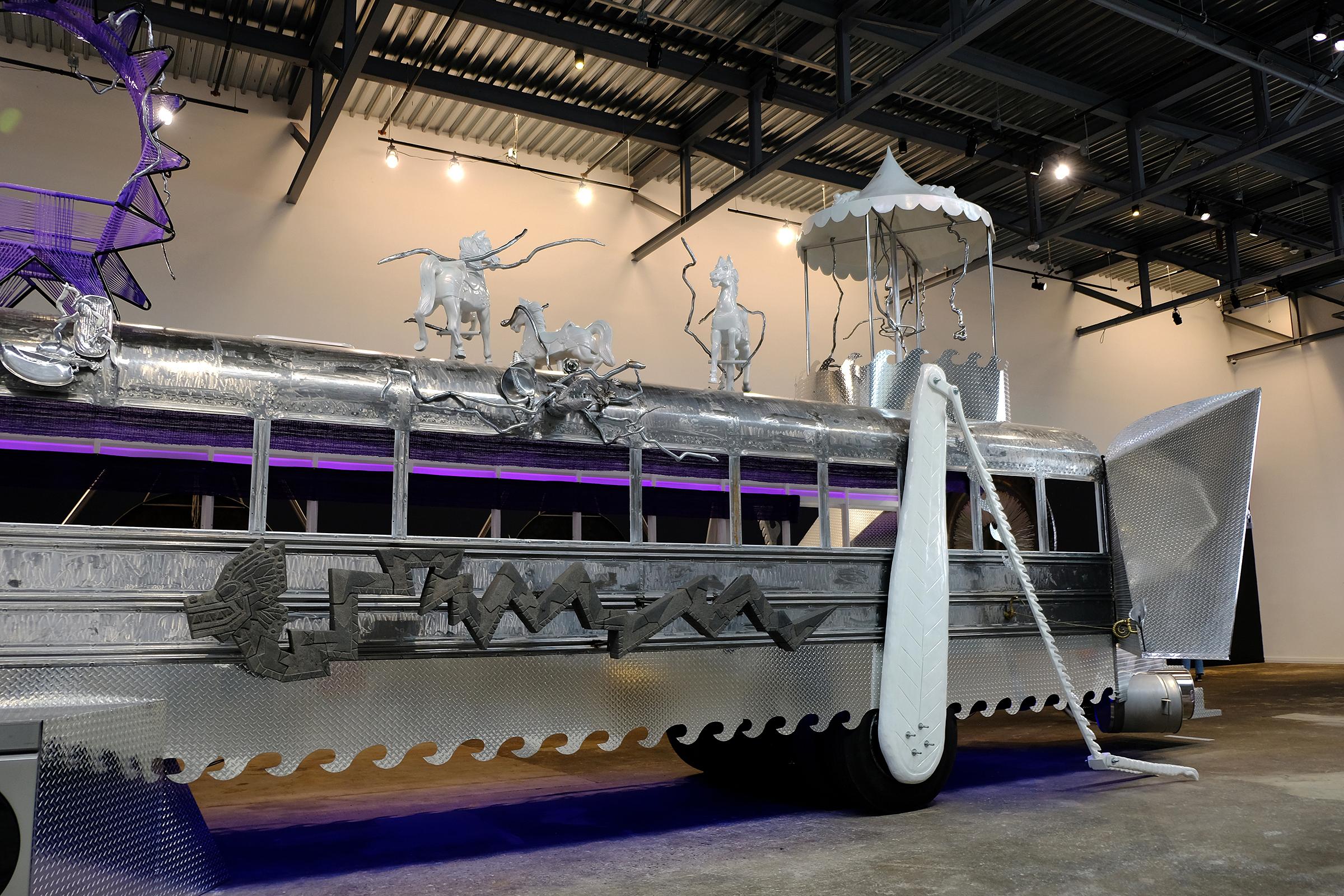 The exhibition truly has to be seen to be believed, and photos do not do justice to its strangeness, its fantastical decoration, or the sheer gravitas it has in the space. Large metal butterfly wings jut out from either side of the back of the bus as though it might take flight, and a giant crank-like grasshopper leg looks poised to hop the bus up and down. Dragons are detailed on the side and front. An empty carousel with what seems like metal lightning rods stands on top, and carousel horses seem to dance beside it, as though freed by the blast. A giant purple lawn chair that seems like it should be the seat of some sort of sun deity sits on top. A chandelier hangs from the front, along with tons of dangling cutlery. Everything feels like it’s invigorated with hyper-realism and mythological-Miyazaki extravagance. Based on how elaborately it’s decorated on the outside, I was surprised at how sparse it is on the inside, just one gong at the end of a long narrow passage.