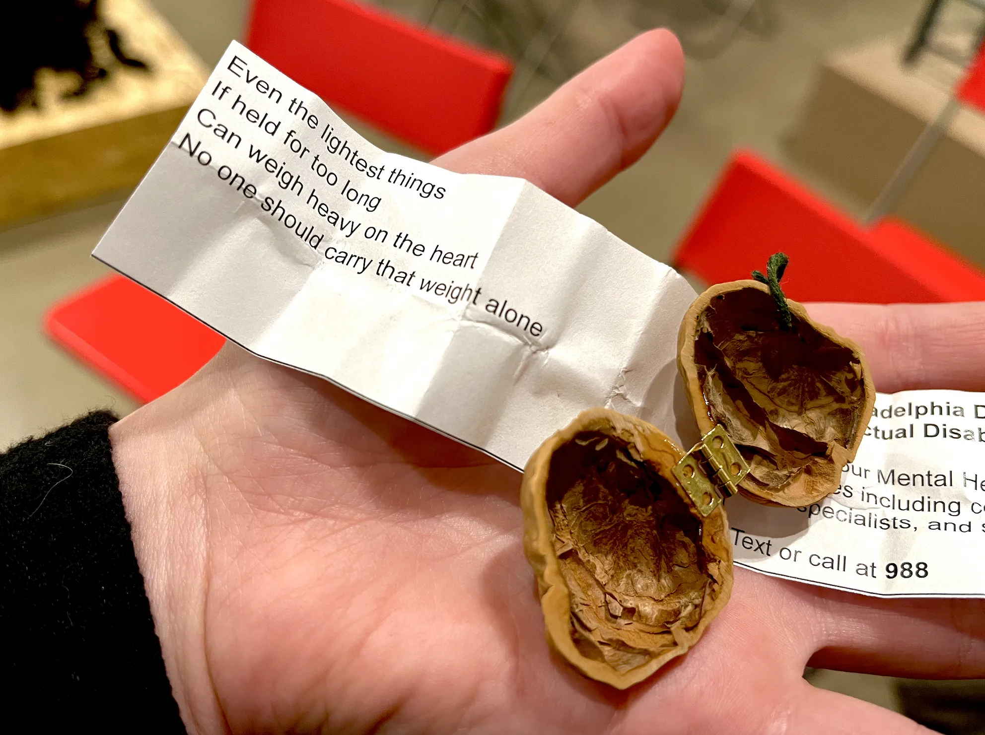 “Even the lightest things/ If held for too long/ Can weigh heavy on the heart/ No one should carry that weight alone,” read the short stanza delivered to my hand via robot arm.