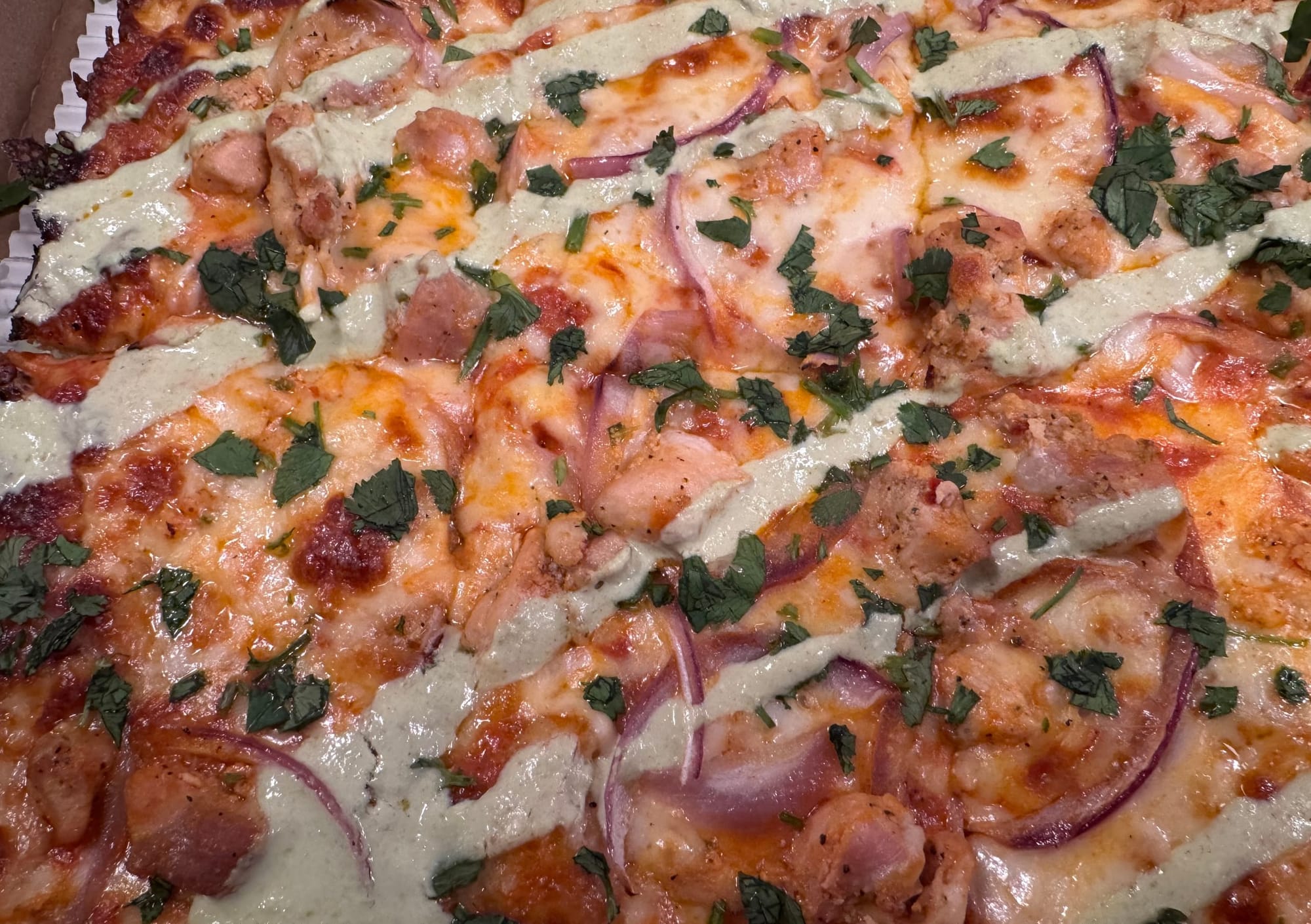Add in red onion, a bit of cilantro (feel free to add even more fresh cilantro when you get this pie home) and a yogurt chutney drizzle to connect it all, and you’re in business.