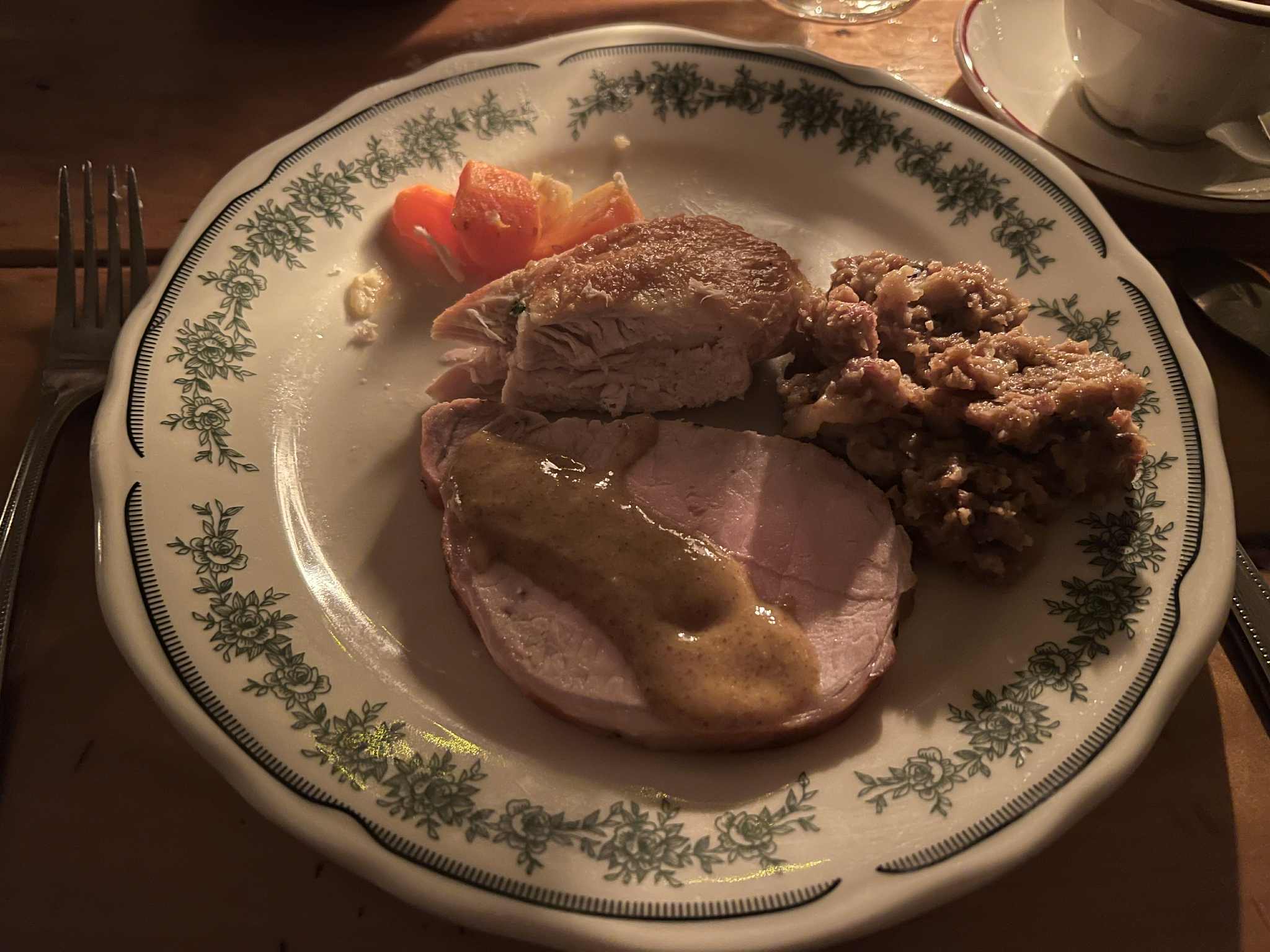 We enjoyed a seasonal menu of fresh-baked bread and jam, squash soup, roasted chicken, carrots and parsnips, smoked pork loin with mustard sauce, sausage stuffing and frosted pumpkin cake. The soup – in particular – was a standout, tasting like a mildly sweet but more savory pumpkin pie filling, perfectly balanced with nutmeg and cinnamon.