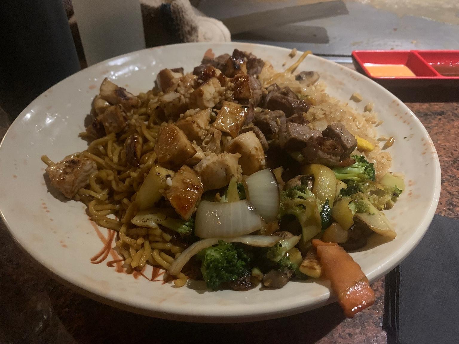 I dipped my fork in the ginger sauce and spicy mayo I had on the sides, mixing everything together in an aromatic mess of food. I carefully put each element on my fork — a couple of veggies, some rice, a few noodles, a piece of chicken and a piece of steak. The flavors were each distinct, a testament to the skill of the chef. Yet like the scorpion bowl, they melded together perfectly. The saltiness of the steak was a perfect compliment to the milder juiciness of the chicken. Everything tasted amazing.