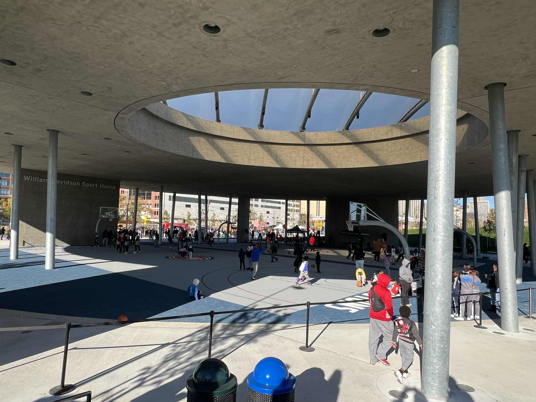 Adjacent was the closed-off Gilbert Family Foundation Water Wonderland, a splash zone which apparently features jets, sprays and streams for kids to play in, which will be fun to see when it opens after things warm up again next year. On the other side of the park was the 28,000 square-foot William Davidson Sport House, a circular open-air pavilion and community space that features two full-sized basketball courts under a 2000-foot skylight, which was pretty cool.