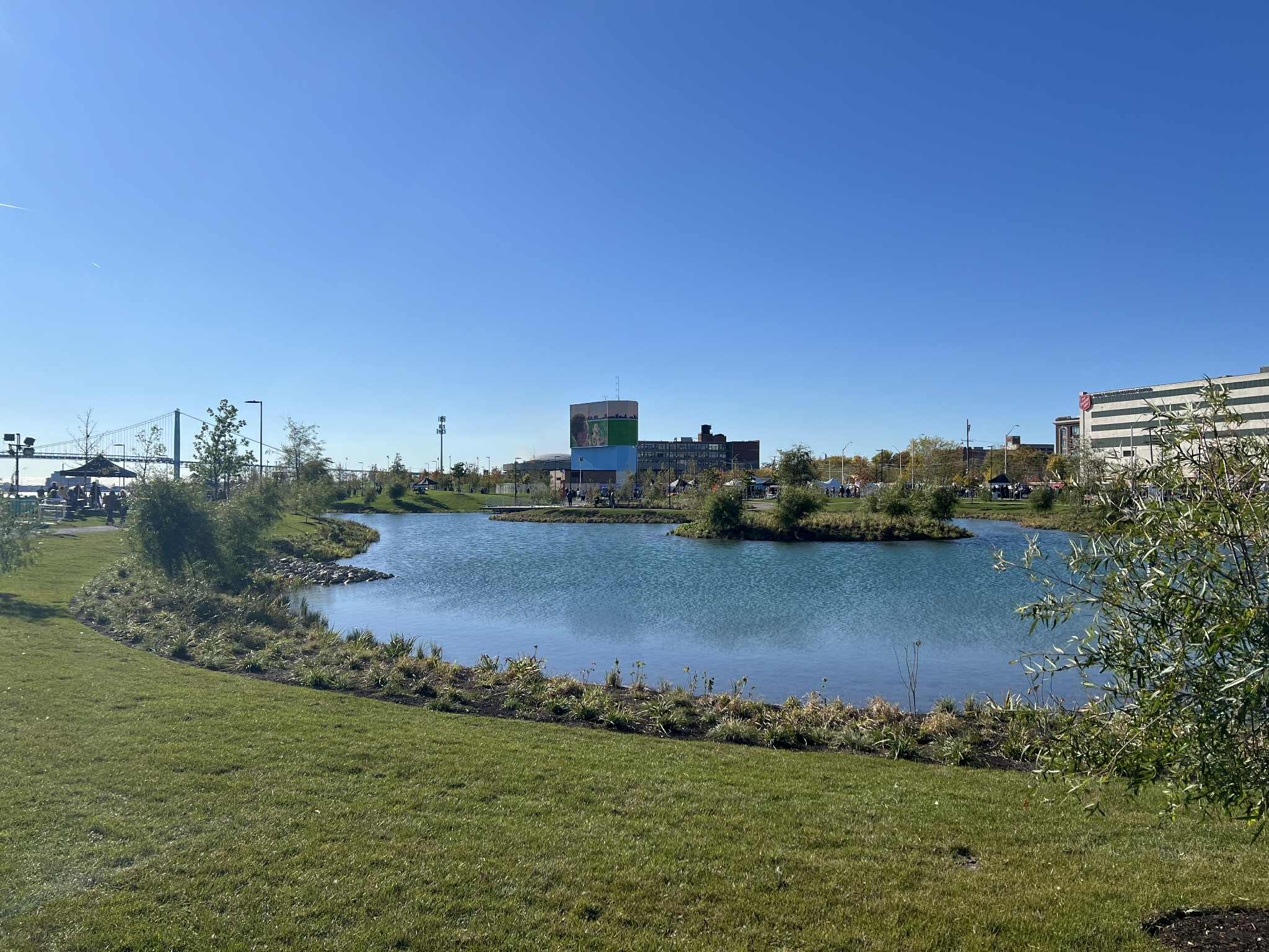 The $80 million, 22-acre Ralph C. Wilson, Jr. Centennial Park has been under construction since 2022, transforming a stretch of the West Riverfront to include kids play areas, a sports facility and a greenway community gathering space, plus an expanded stretch of the riverwalk and lovely views of the Detroit River and the Ambassador Bridge to Canada.
