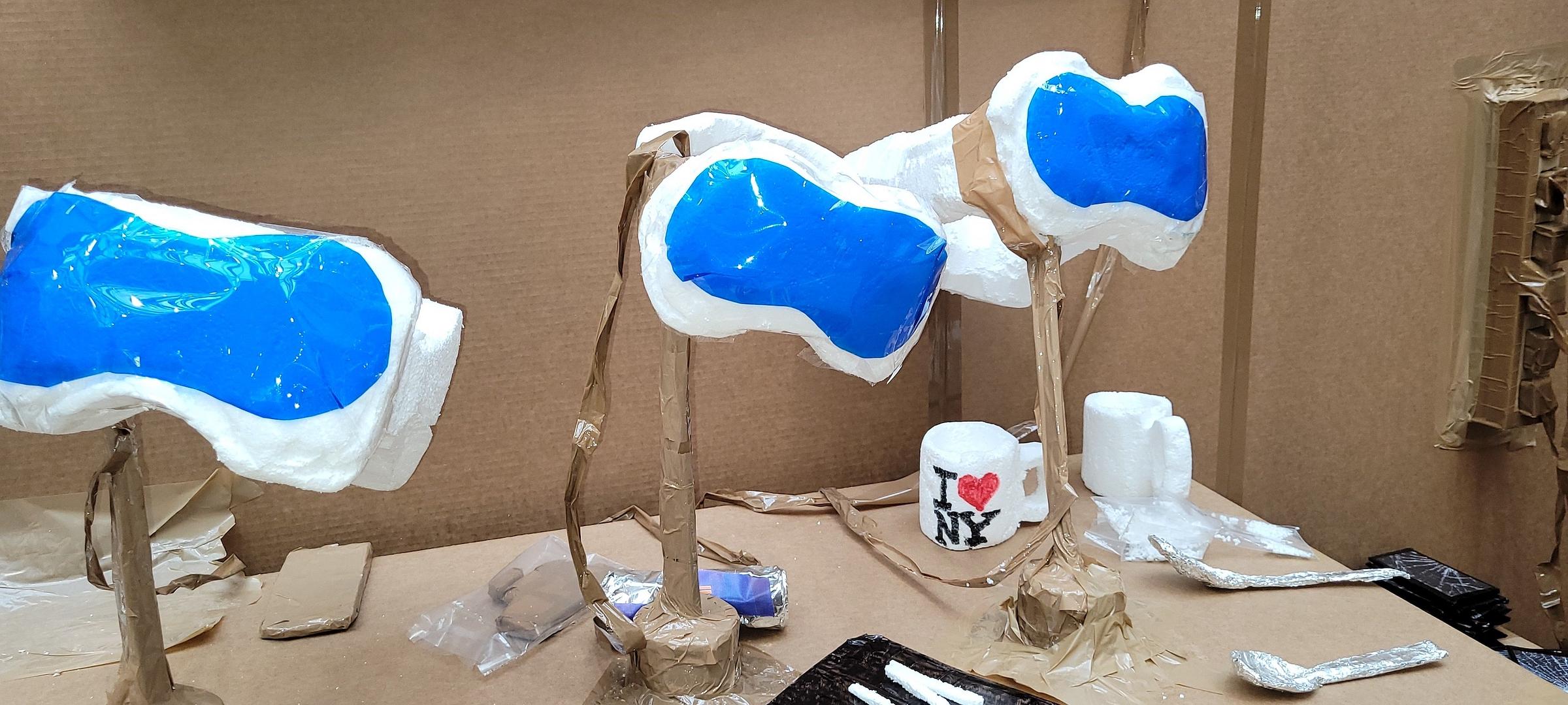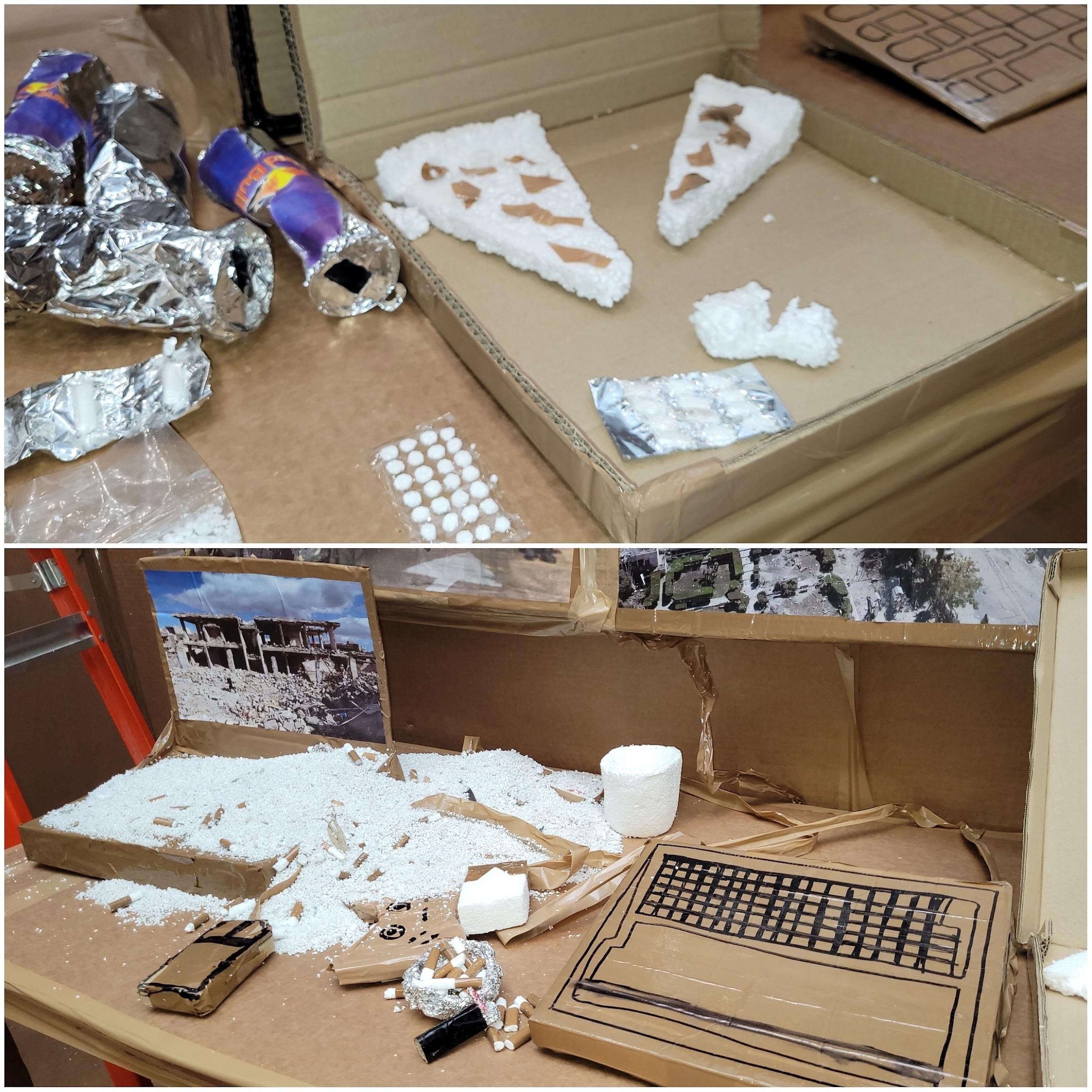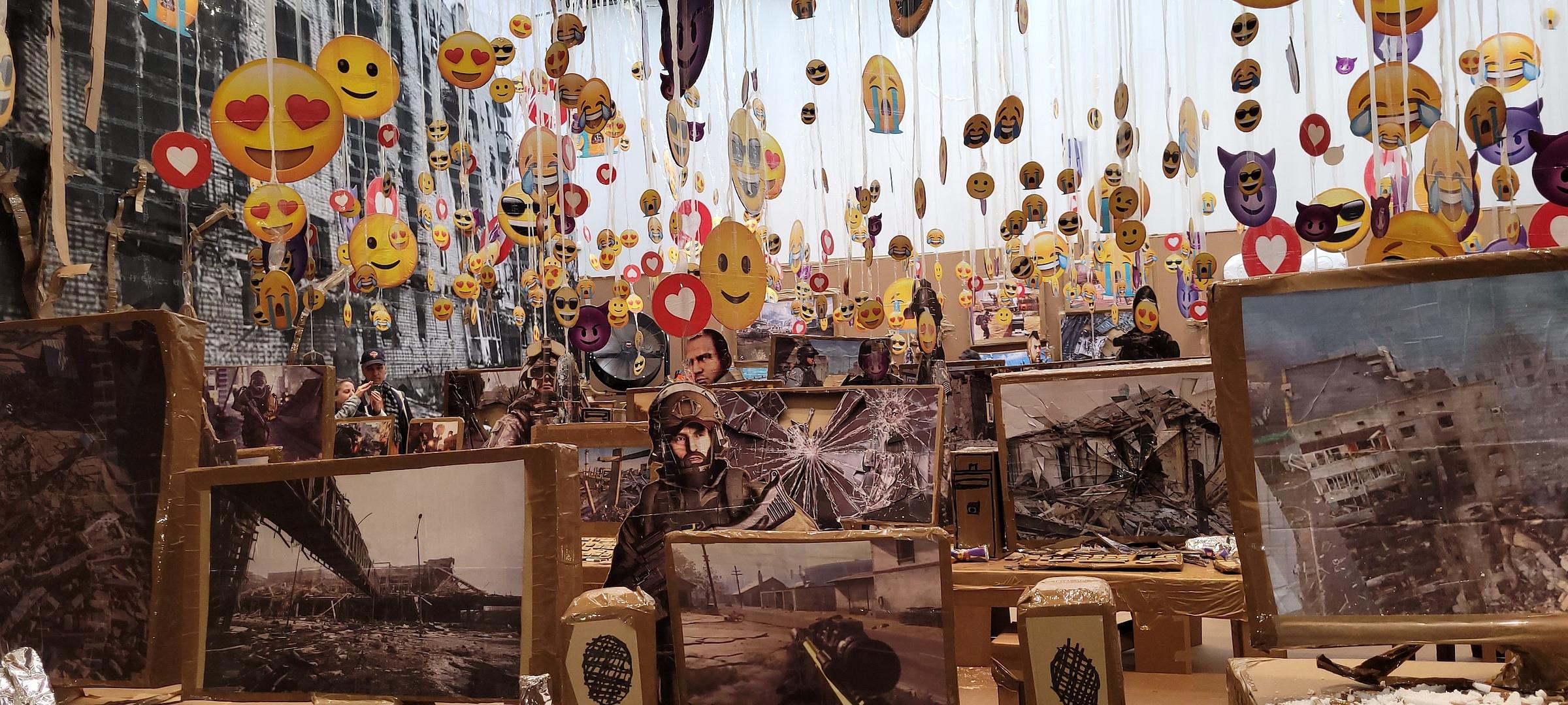 Set up on tables in rows, an overwhelming, heaping mess depicts exploded buildings and ruined neighborhoods in shards of war scenes on shattered computer screens made out of pictures glued to cardboard. Amidst images of buildings blown to collapsing skeletons, dangling flat, uniformed, armed soldiers, and yellow-faced and purple emojis that define our current generation swing from plastic tape stretching from the ceiling.