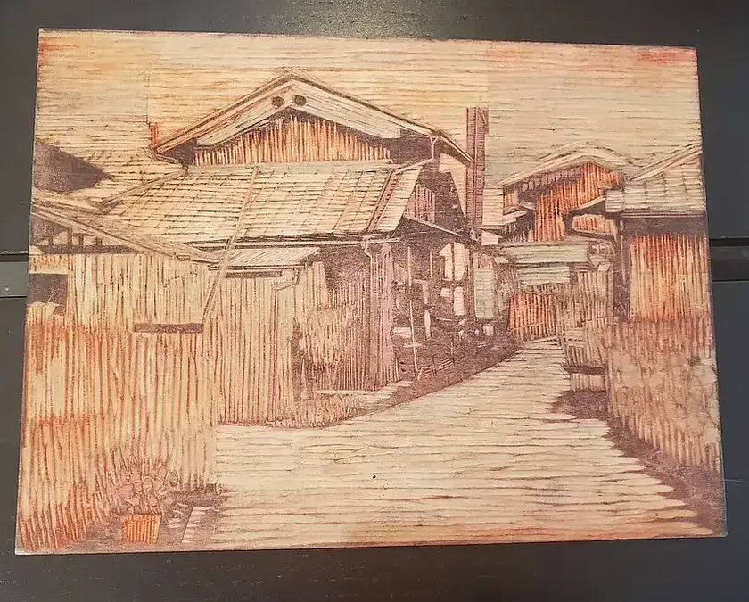 A woodcut was passed around during the talk that reached me in the spillover room. Instinctively, I ran my fingers along the grooves etched into the wood in soft shades of umber and moth. Sugita talked about becoming so immersed in the process of etching that he found himself “identifying… as part of the space.” His hometown in Japan and his established life in the Bay Area, he said, “are constantly changing, but with the visual integrity of place intact.”