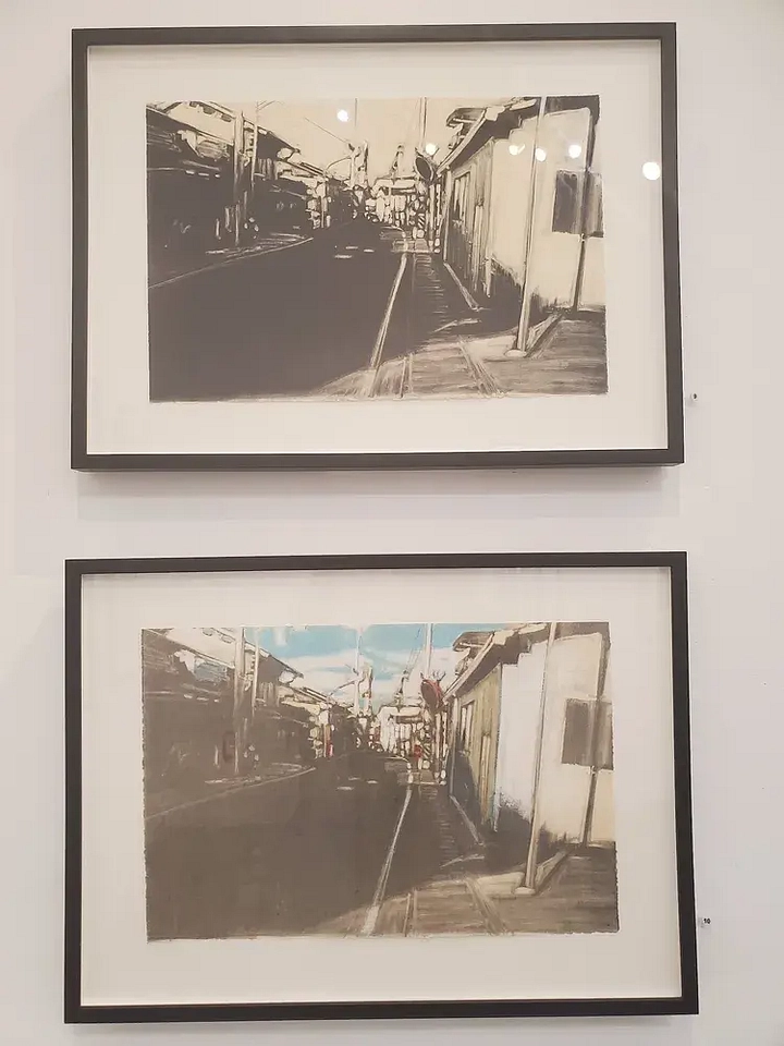 On the walls of the gallery, Sugita has several series of similar paintings and drawings, seemingly of the same place markers in Japan and the Bay Area, but with the light and shadows modified and modulated. It looks as if he’s trying to work out which memory seems the most accurate, or the most fitting for each mood. Walls of his art, identical frames in neat squares evenly spaced, mimic the act of the mind’s eye scrolling through images, bridging the gulf between experience, presence, and memory. A young girl wearing a mask on a train platform, repeated renderings of small-town alleys, a chair in a backyard, the shifting of shadows, seem less about the recreation of images and more about an artist trying to work out the idea of “home” and “place.”