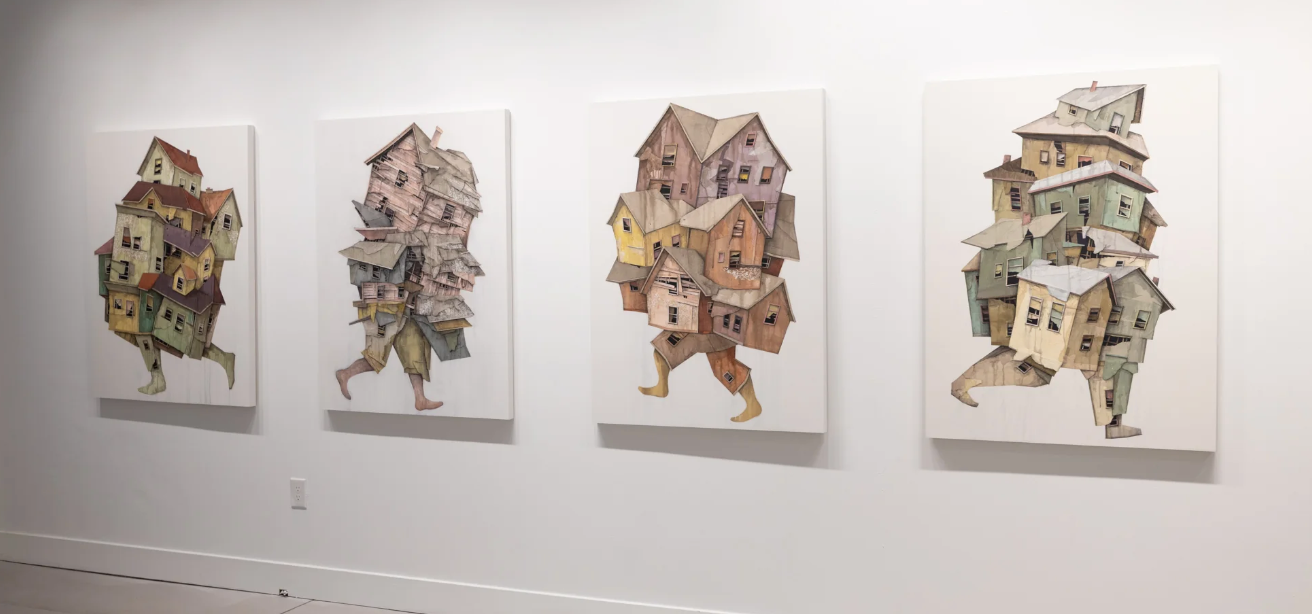 The piece is part of Pittsburgh artist Seth Clark’s latest exhibit “Passing Through,” a whimsical series about homes on the go. Through sculpture, drawing and paint, Clark shows off housing stock with legs … literally.