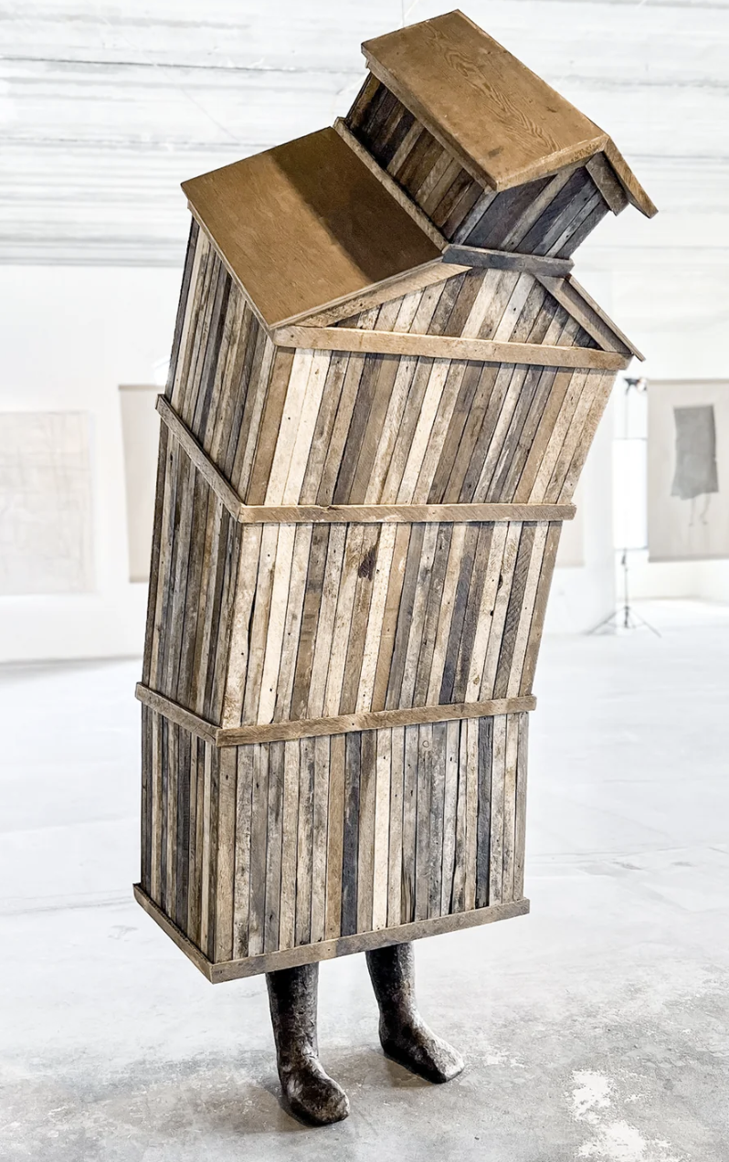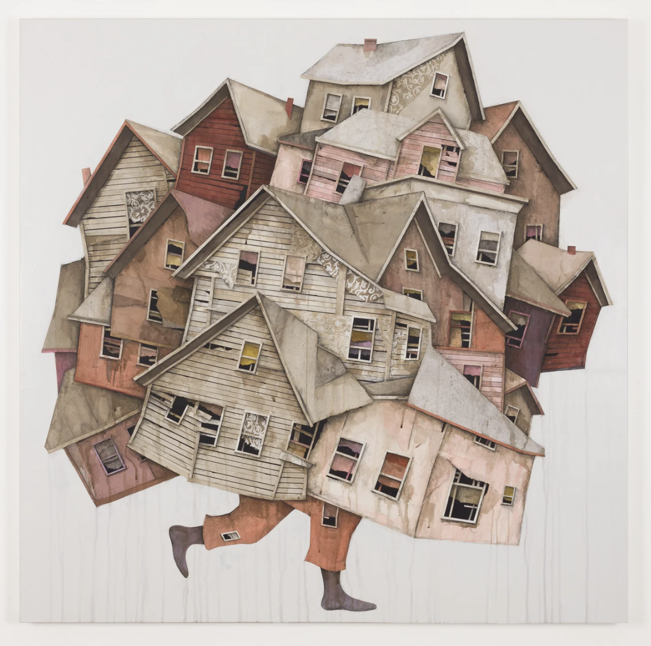 “Mobile Home” serves as the exhibit’s sculptural show stopper. Designed to tower above any average human head at seven feet tall, the statue of a house boasts a build that is both humble, like a boxy armoire or old barn, and bold, like a wide-shouldered soldier. It’s the most attention-grabbing work as well as the piece that’s paying the most attention. While other houses Clark illustrates are oriented forward in motion, stumbling into the future, Mobile Home’s gable head stares down at its own feet in self-aware fashion — and simultaneously confronts its audience at eye-level.