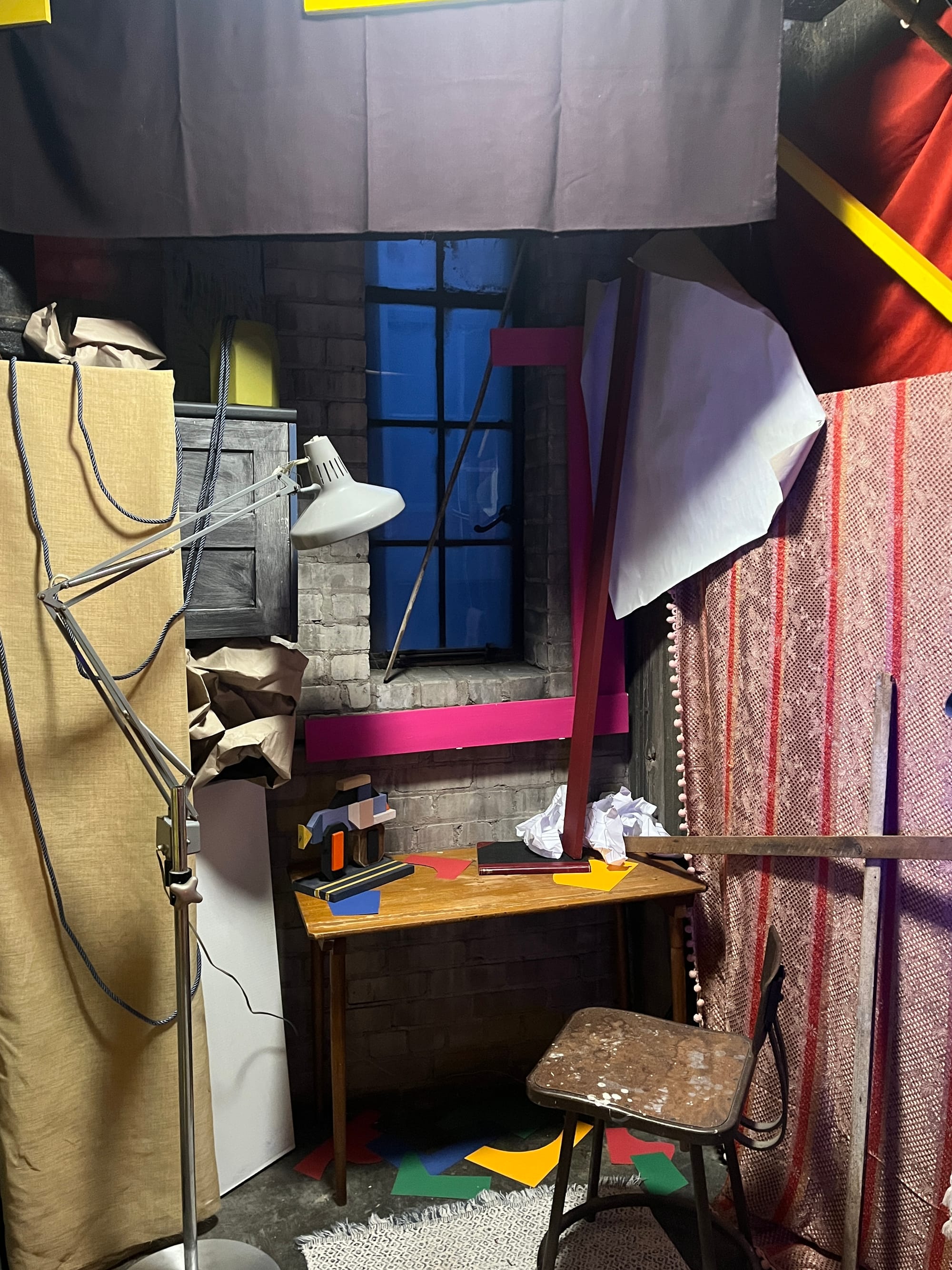 Another piece that lingered with me was Nine of Pentacles by Jesse Kassel, tucked into a small room off the stairwell. The space resembles a chaotic office: mismatched fabric plastered to and hanging from the walls, papers scattered across a desk and floor—some carefully arranged, others crumpled and discarded.