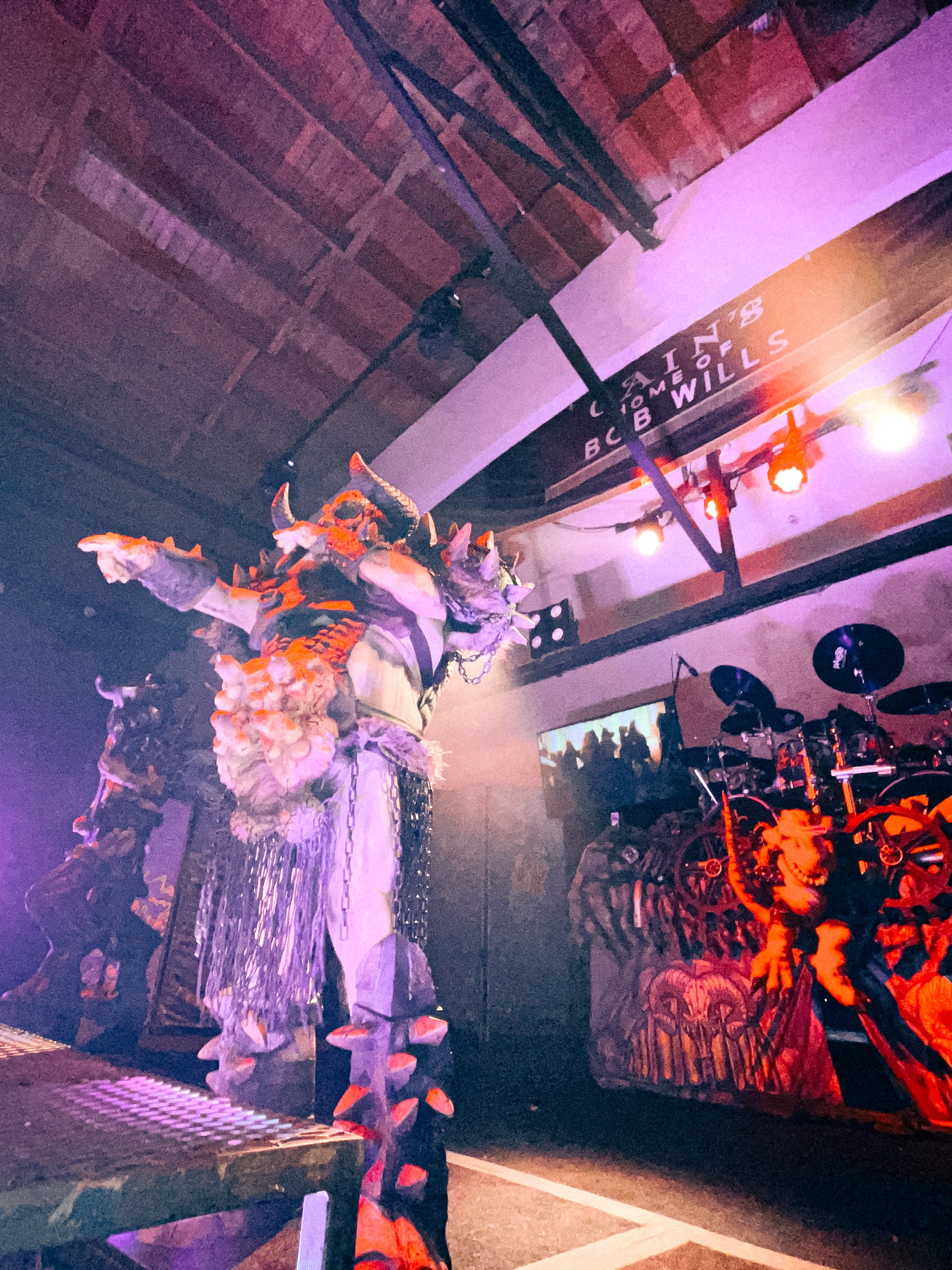 GWAR’s stage show at Cain’s was less politically charged than others I remember, save for the Epstein nods, the maiming of an ICE agent, and a Kristi Noem with giant fake breasts getting gutted. (I thought the knockers were a nod to the outing of her husband as a big tiddie bimbo, but concert reviews from before Bryon Noem’s reveal indicate that her costume hit the road well-endowed.)