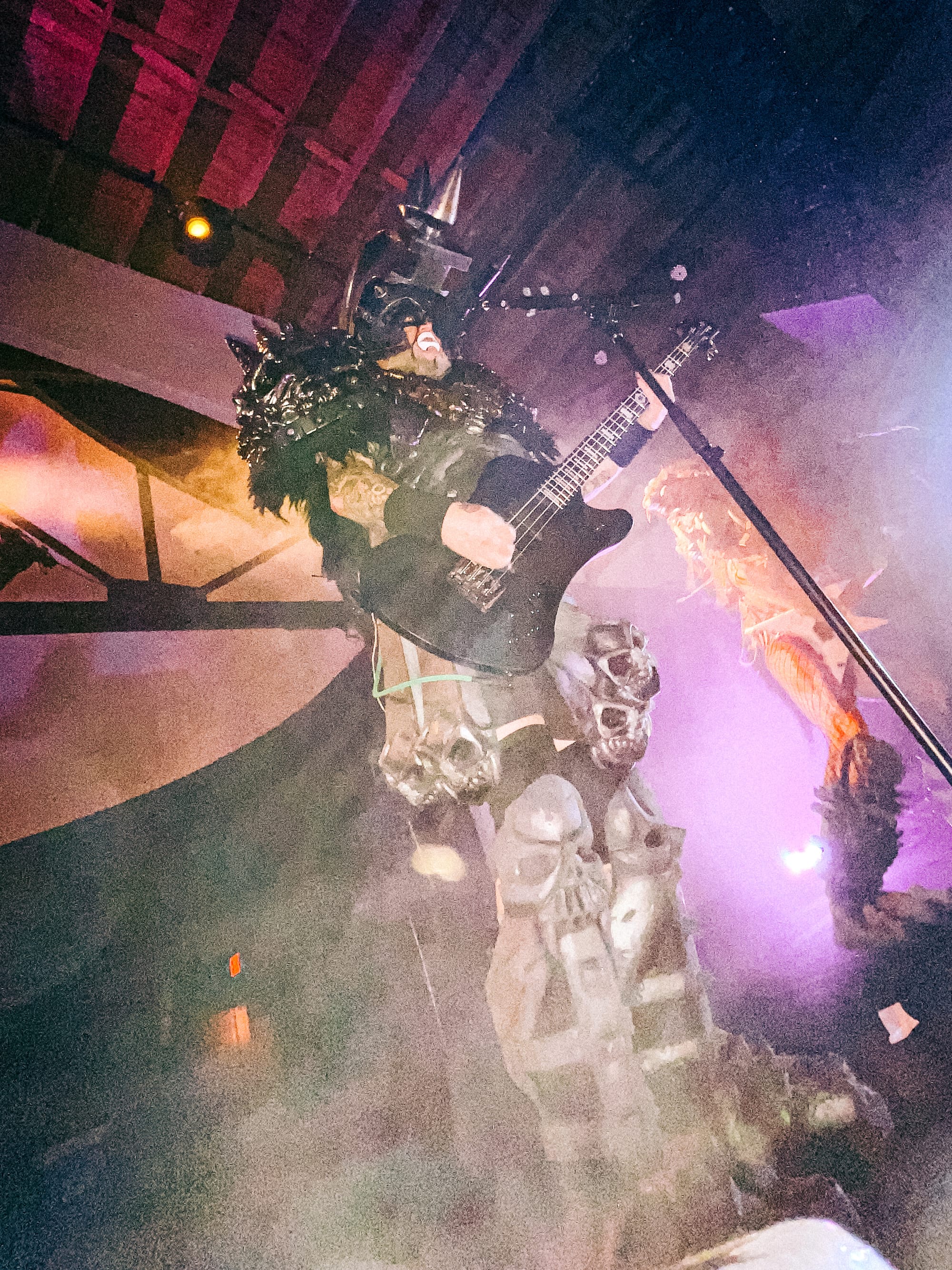 Last Thursday’s show at Cain’s was a special one in my history with this band: it was the first GWAR show for my partner and multiple other friends, whom I instructed to wear white shirts they didn’t care about. I missed Australian grindcore opener King Parrot (not to be confused with death metal band Hatebeak, whose singer was actually a parrot) but caught some of Soulfly’s slammy nu-metal. If non-GWAR aliens ever pull up to Earth and ask what nu-metal sounds like, show them “jumpdafuckup” for the most crystallized specimen in the genre.