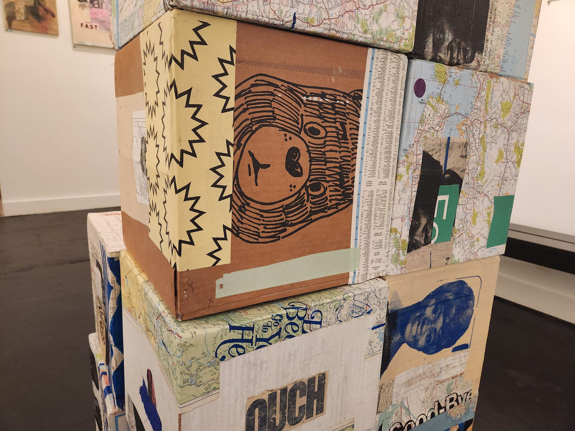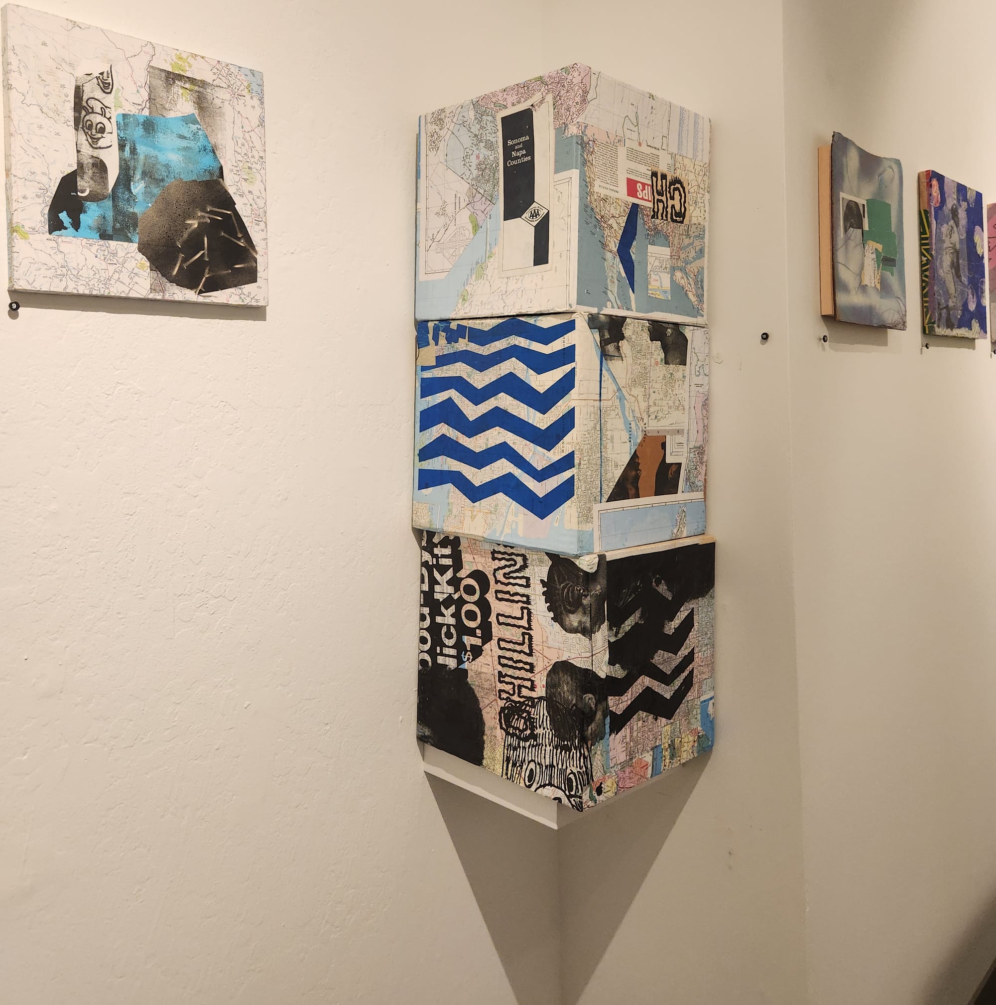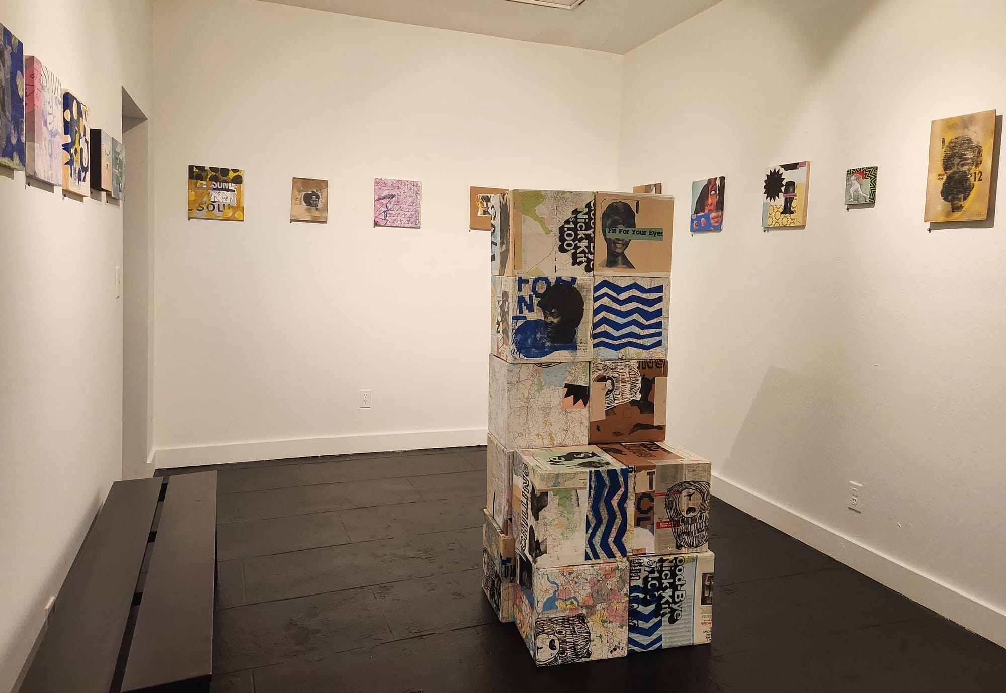 Deeply informed by time and space, Anthony R. Grant fashions collages with people and places near and dear to his heart, while working within the confines of outside full-time employment, fatherhood, and the general hustle of life here in the Bay. (That employment: product designer at one of the big three that shall not be named, a “big company” he’d “love to leave" but, ya know, art supplies ain’t cheap.) His solo show “moments in time,” which closed last Friday at Mighty Mighty Studios, was a collection of small hung collages works overlooking a jenga’d tower of equally intricately printed boxes.